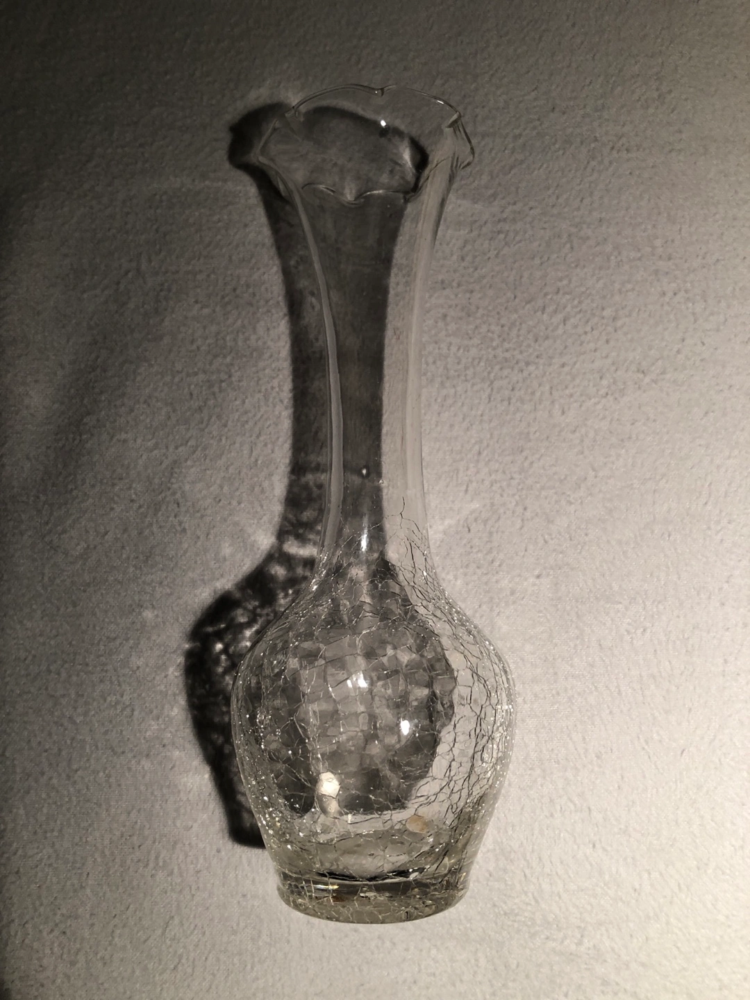 Beautiful vintage crackle glass vase. Tall and slender design. Scalloped rim. Clear glass with a unique texture.