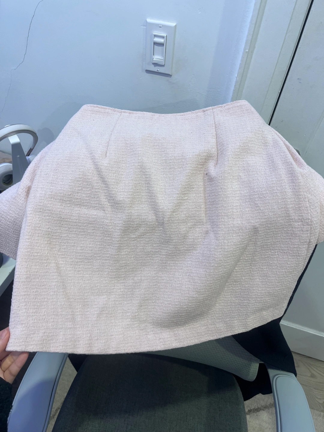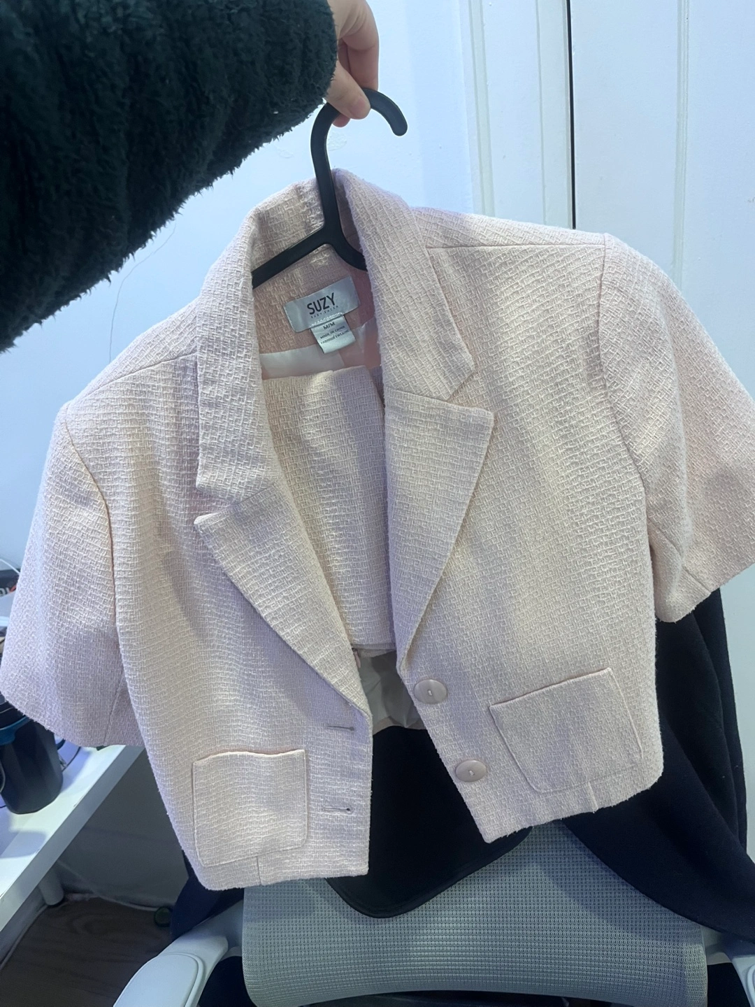 Adorable pink blazer and skirt set. Short sleeves and cropped t-blazer. Matching mini skirt, stitch for adjustment can be removed easy, worn only twice. Original was 80+tax