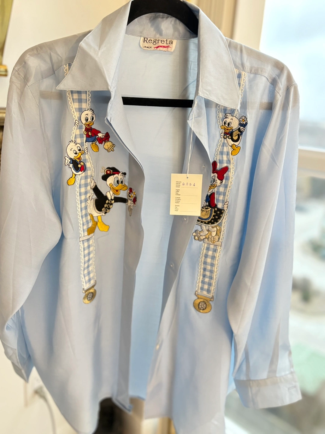 Unique light blue, long-sleeved button-down shirt. Features embroidered Disney characters. Made in Italy. Excellent condition. Brand new vintage