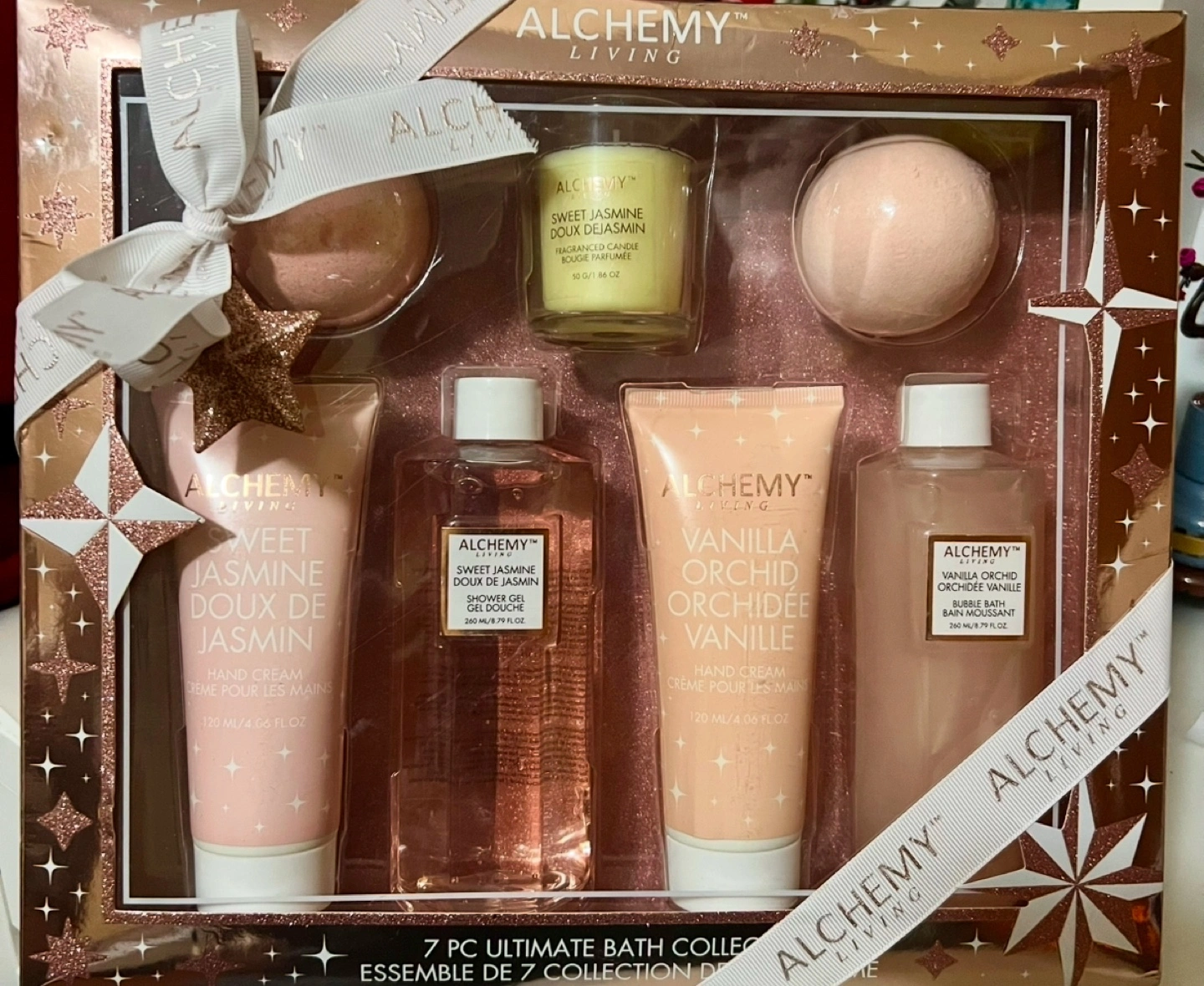 Seven-piece bath collection. Includes shower gel, bubble bath, hand cream, and candle. Sweet Jasmine and Vanilla Orchid scents. Presented in a beautiful gift box. Pick up in Bradford $25. Great gift item.