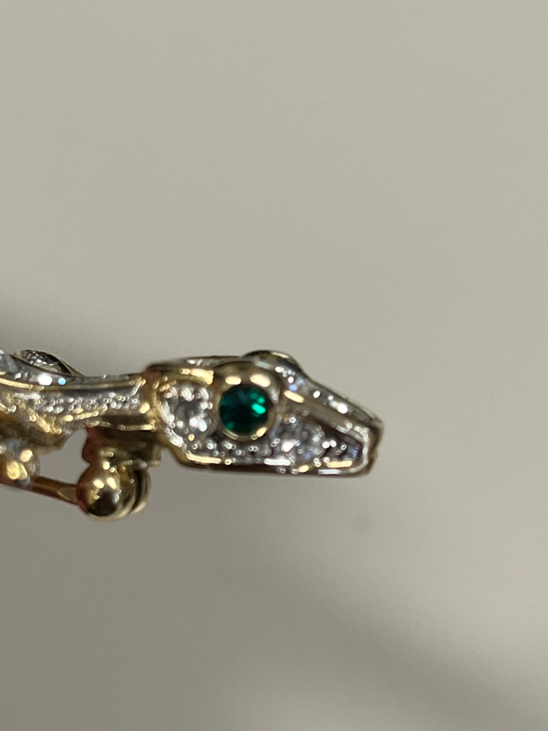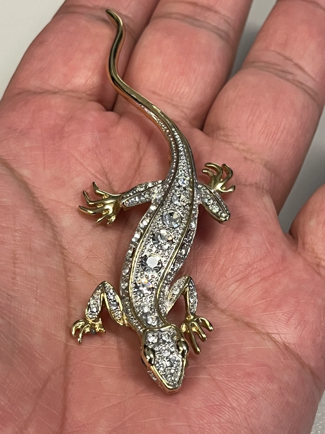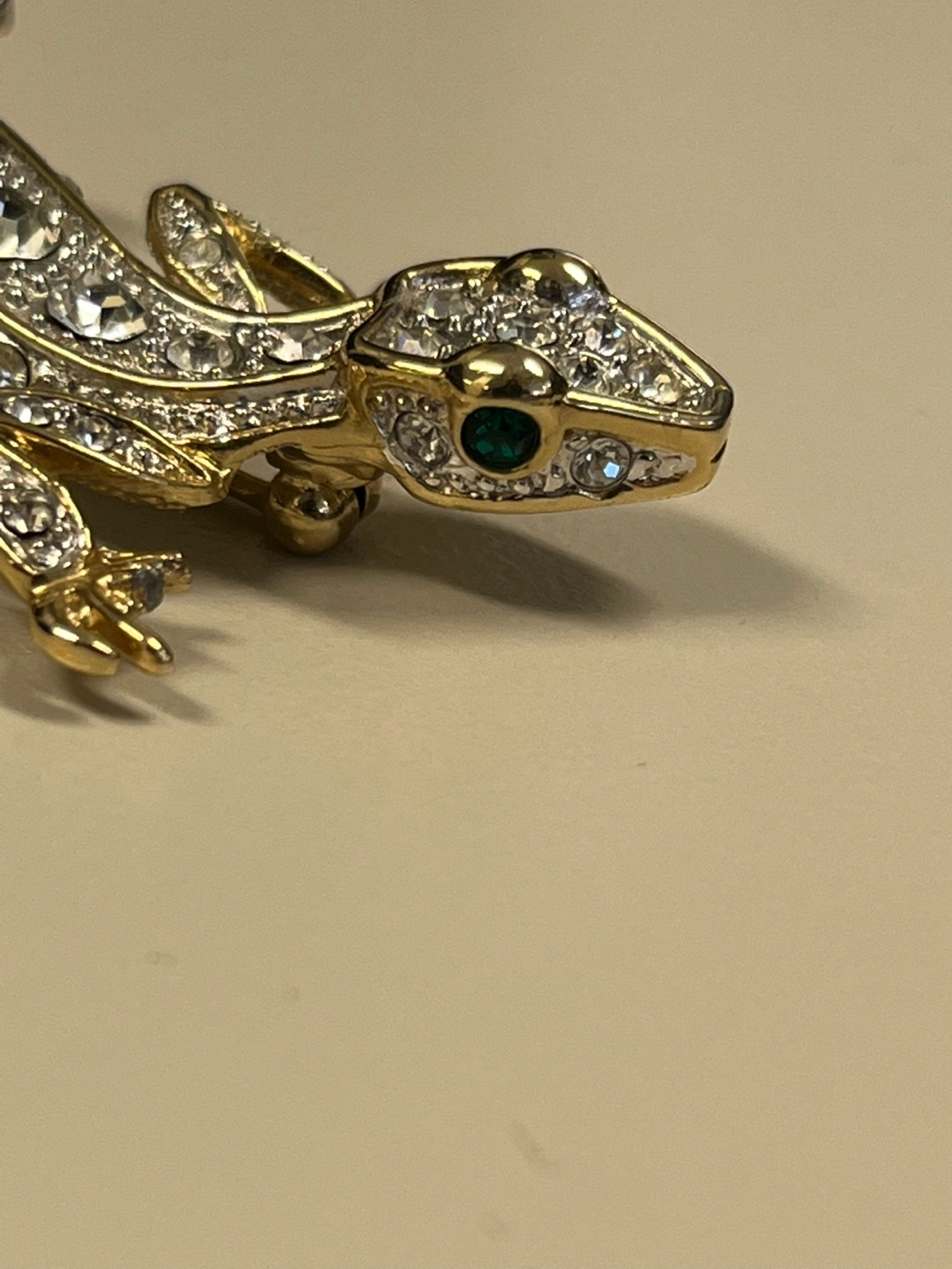 Gold-tone brooch shaped like a gecko. Covered in clear rhinestones. Features green rhinestone eyes. Pin closure. You can pick up by Carlton and Jarvis area Serious enquiries only please. Too many people wasting my time and low balling and not following up.