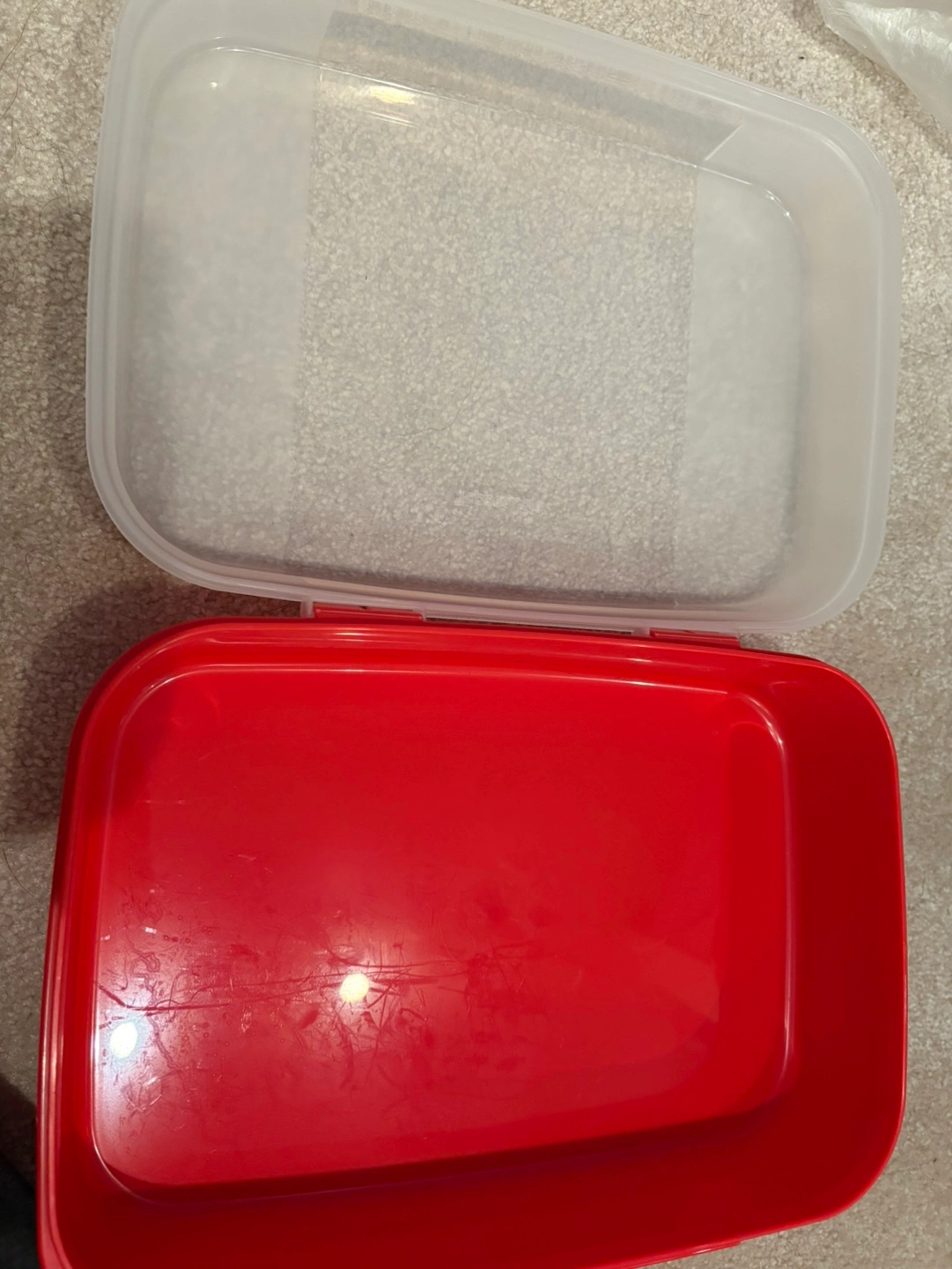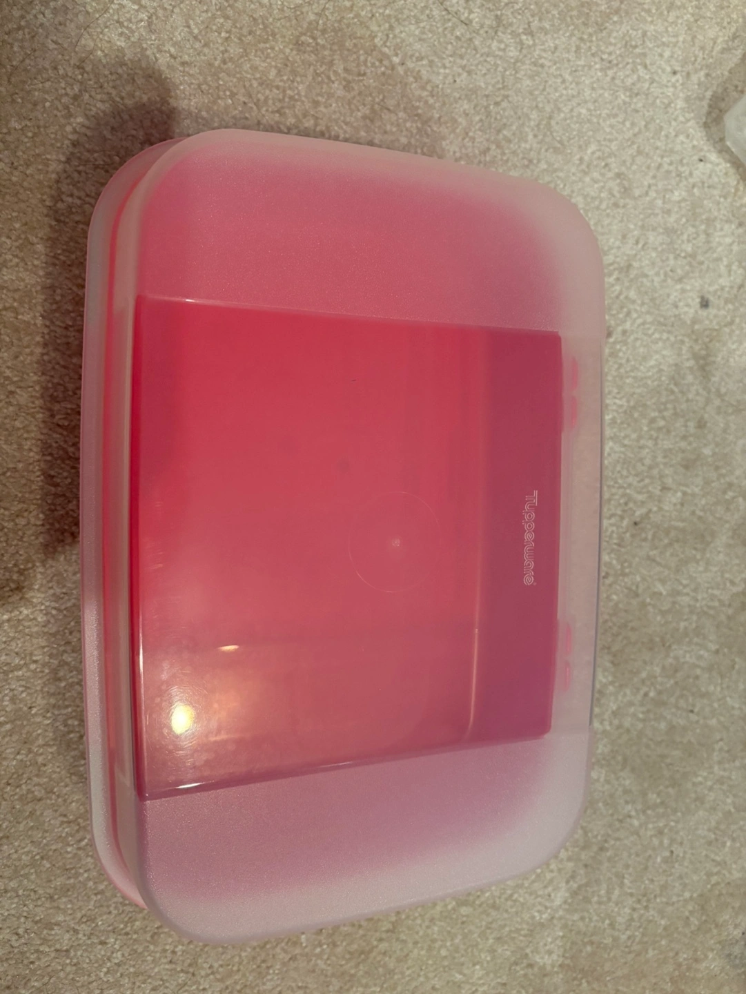 Red plastic container with a clear lid. Great for organizing or storing small items. Or bread and food items Tupperware brand