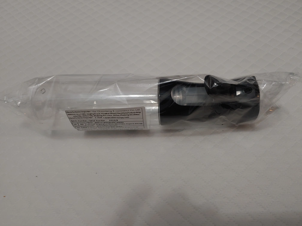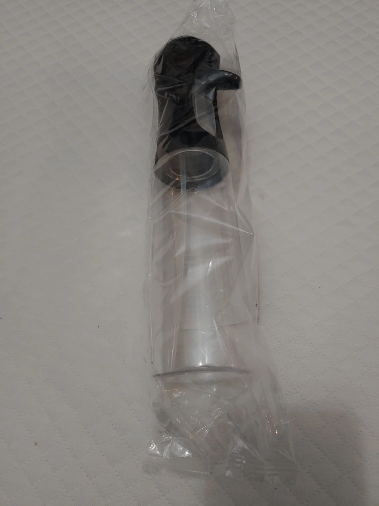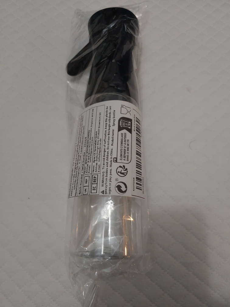 Clear plastic bottle with black top. Pump style sprayer. Perfect for oil or other liquids. Brand new in packaging.