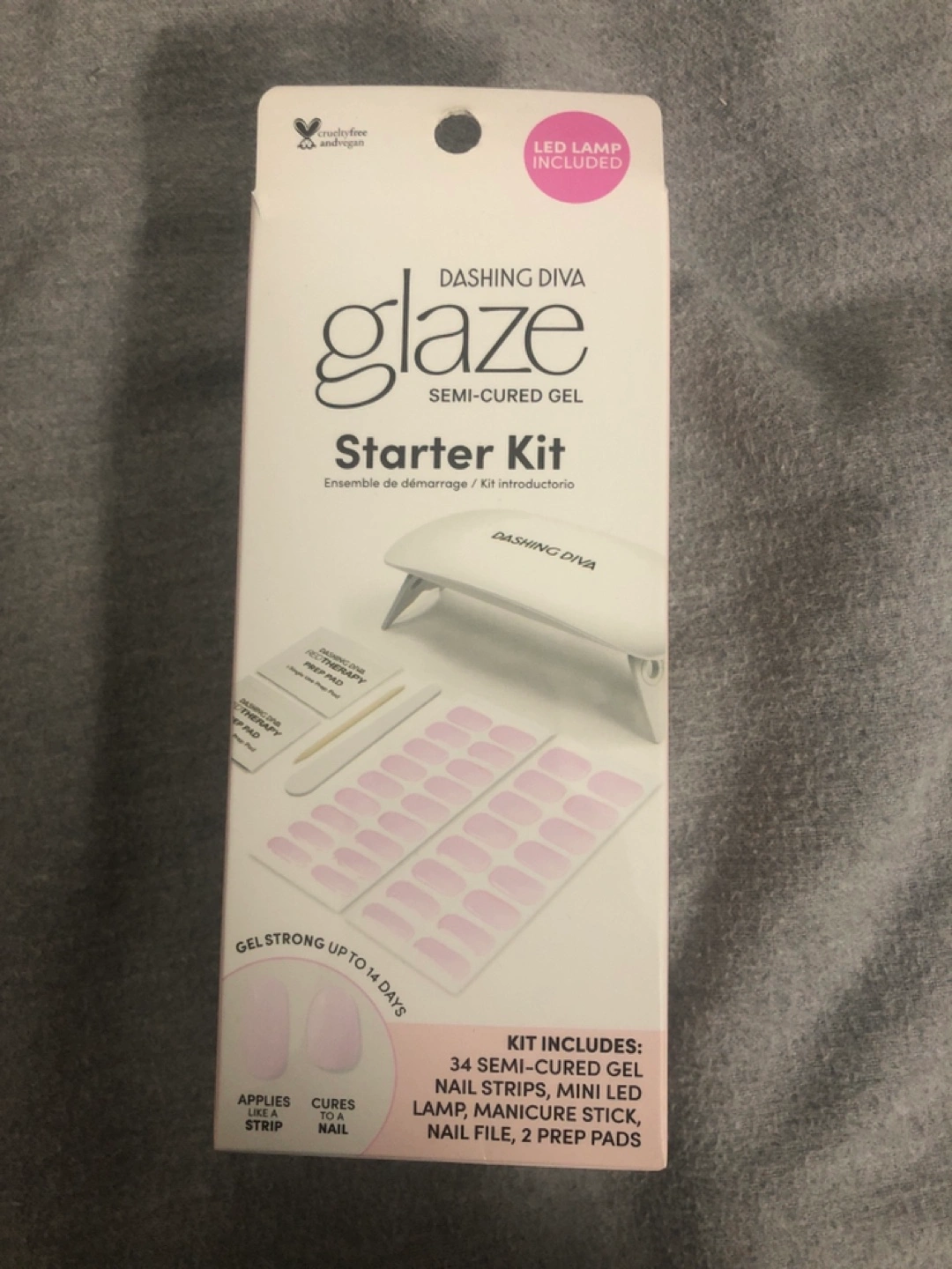 New, unopened Dashing Diva Glaze semi-cured gel starter kit. Includes 34 nail strips, mini LED lamp, manicure stick, nail file, and two prep pads. Gel strong up to 14 days.