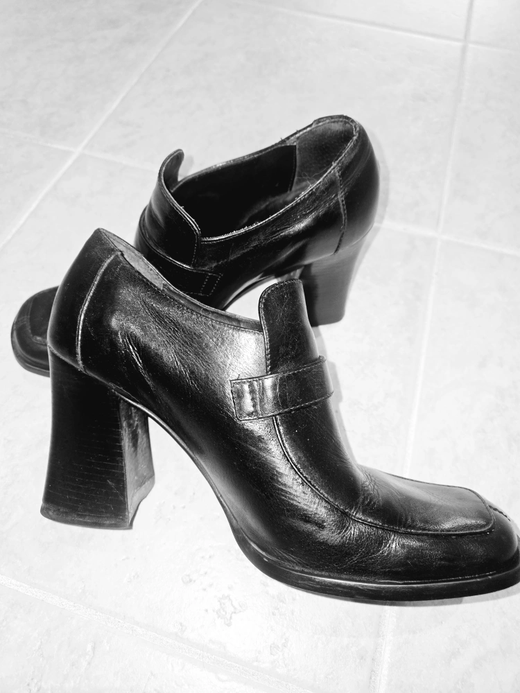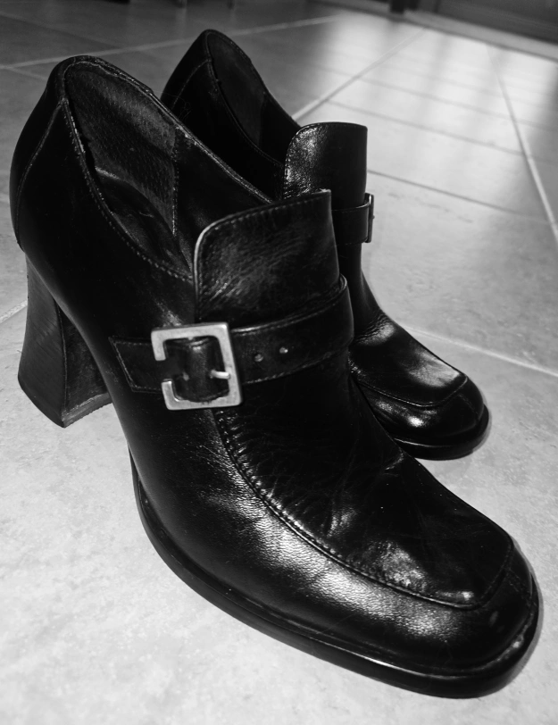 ⚫️ Pair of black leather shoes. Block heels. Slip-on style with buckle detail.