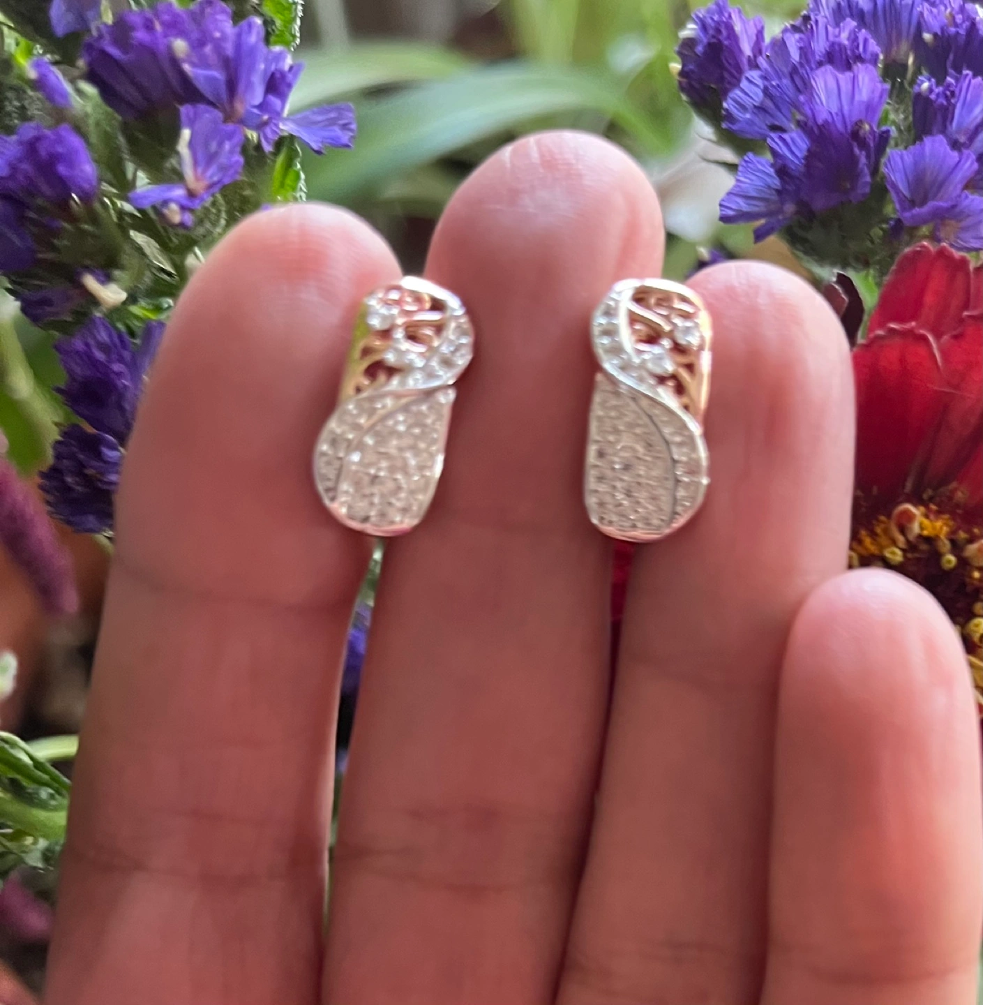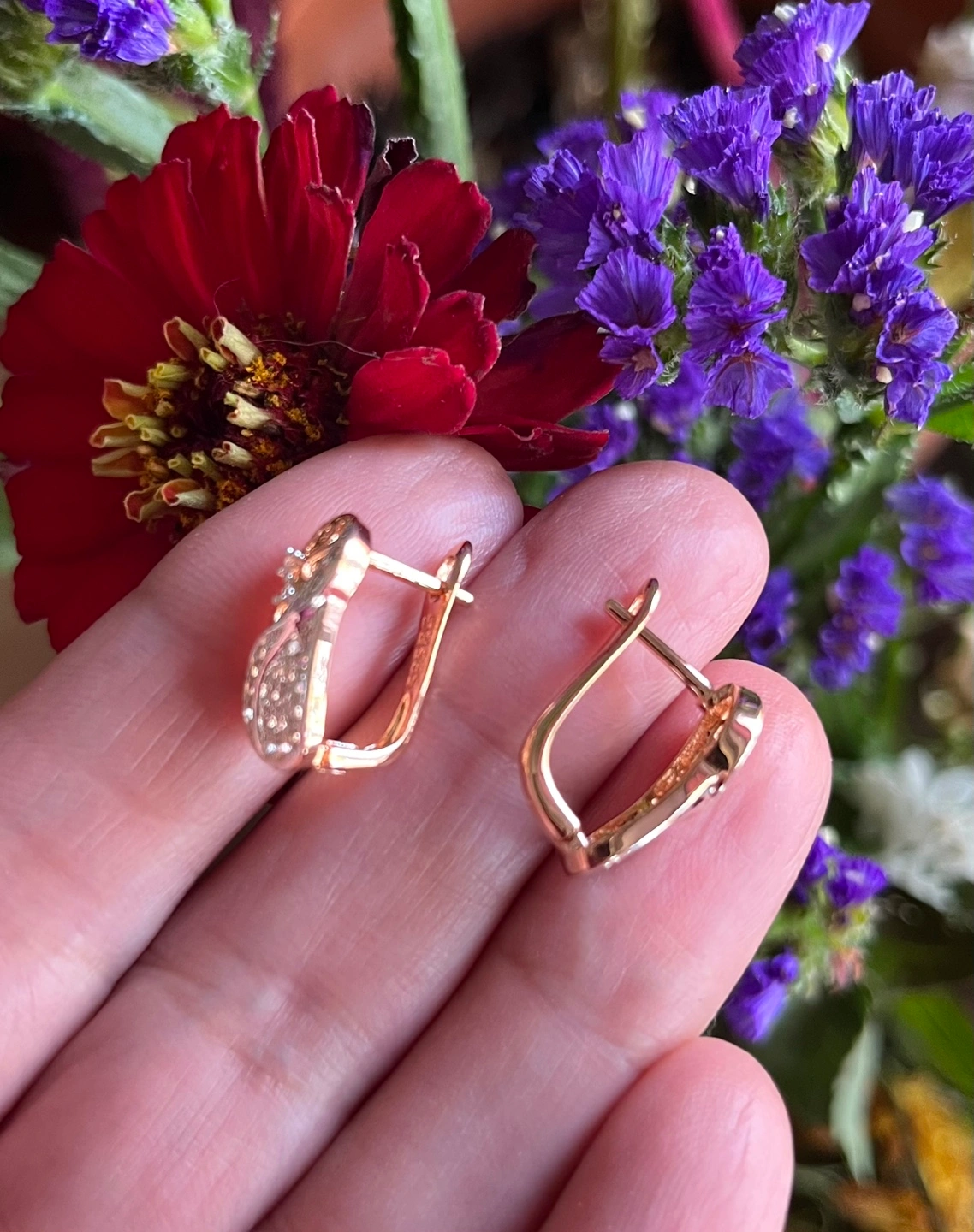 Elegant rose gold tone earrings. Features white zircon stones. Hook closure. Beautiful and delicate design. Perfect for everyday wear or special occasions.