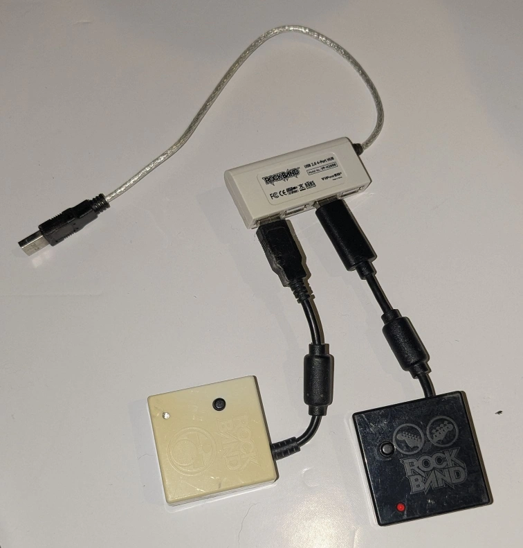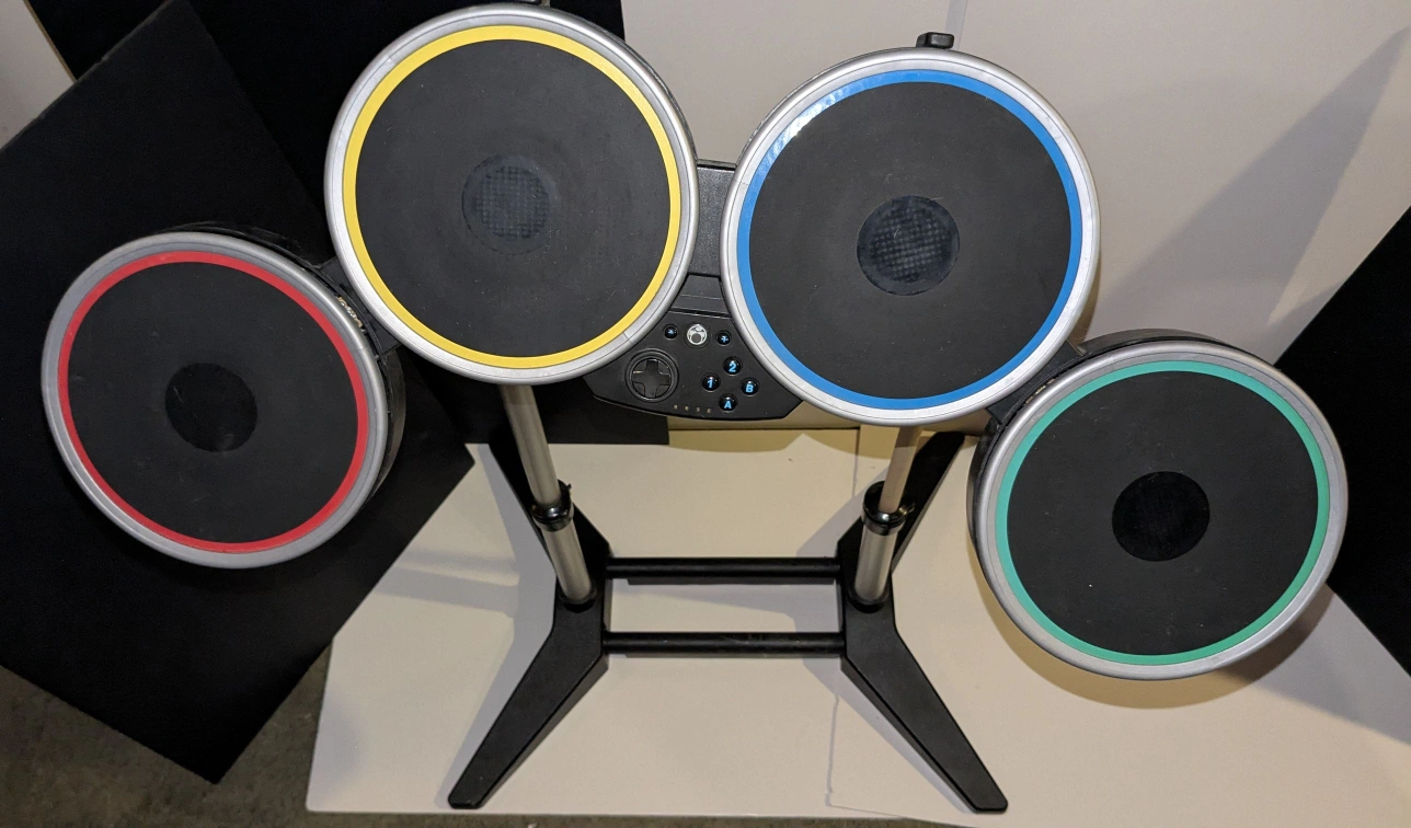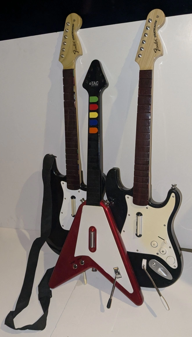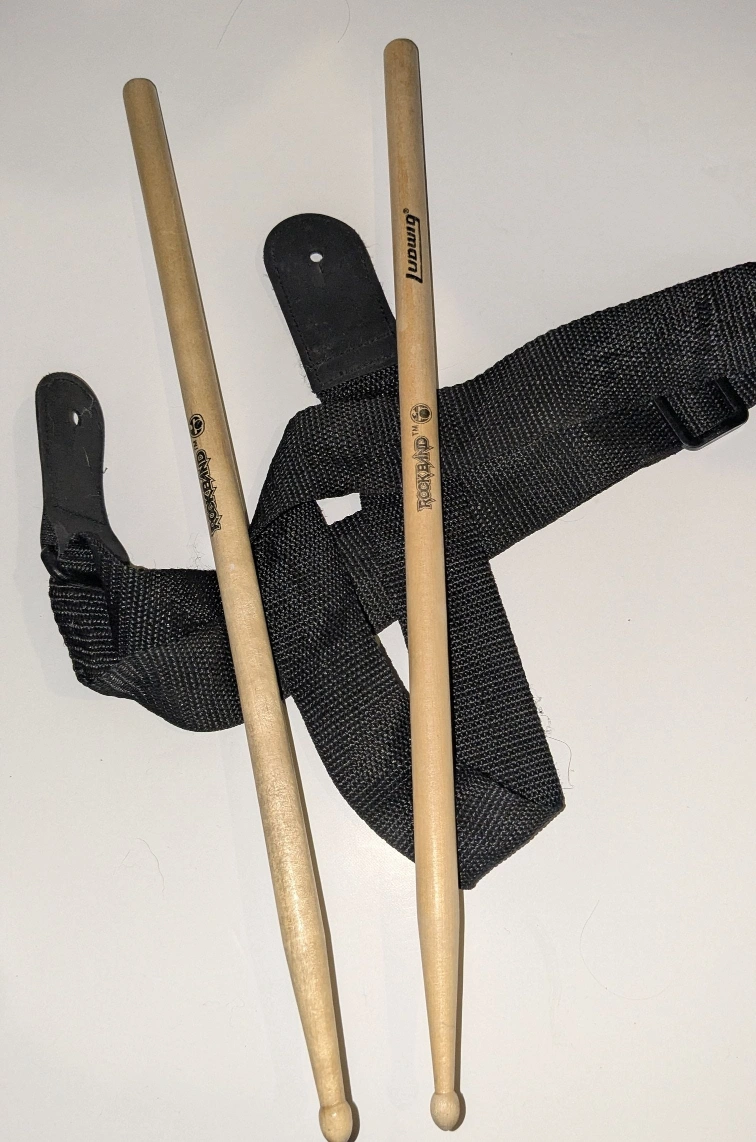 Rock Band PS3 bundle. Includes drum kit with bass pedal, three guitars, microphone, and two games: Rock Band 2 and Lego Rock Band. Rockstar branded Drumsticks and 2 guitar straps included. Great for musical fun! This Rock Band Bundle WORKS VERY WELL on my PS3 System. I have cared well for my PS3 System. I have never opened the cabinet of my PS3. Please note the following; that does not affect the playability of the bundle: - a silver support leg has gone missing in our packing ( we are moving/downsizing). When we locate it, we will contact you & mail it. We have replaced it with a wooden dowel that supports the drums. (see photos) - 2 small leg components are slightly damaged on the ends (not visible when assembled). They still fit snugly into their female counterpart. - One of the guitars does not have a strap Please see photos for all the many RockBand branded playable parts/components that are included. Thank you for looking at our listing. We always welcome questions . From a smoke-free home.