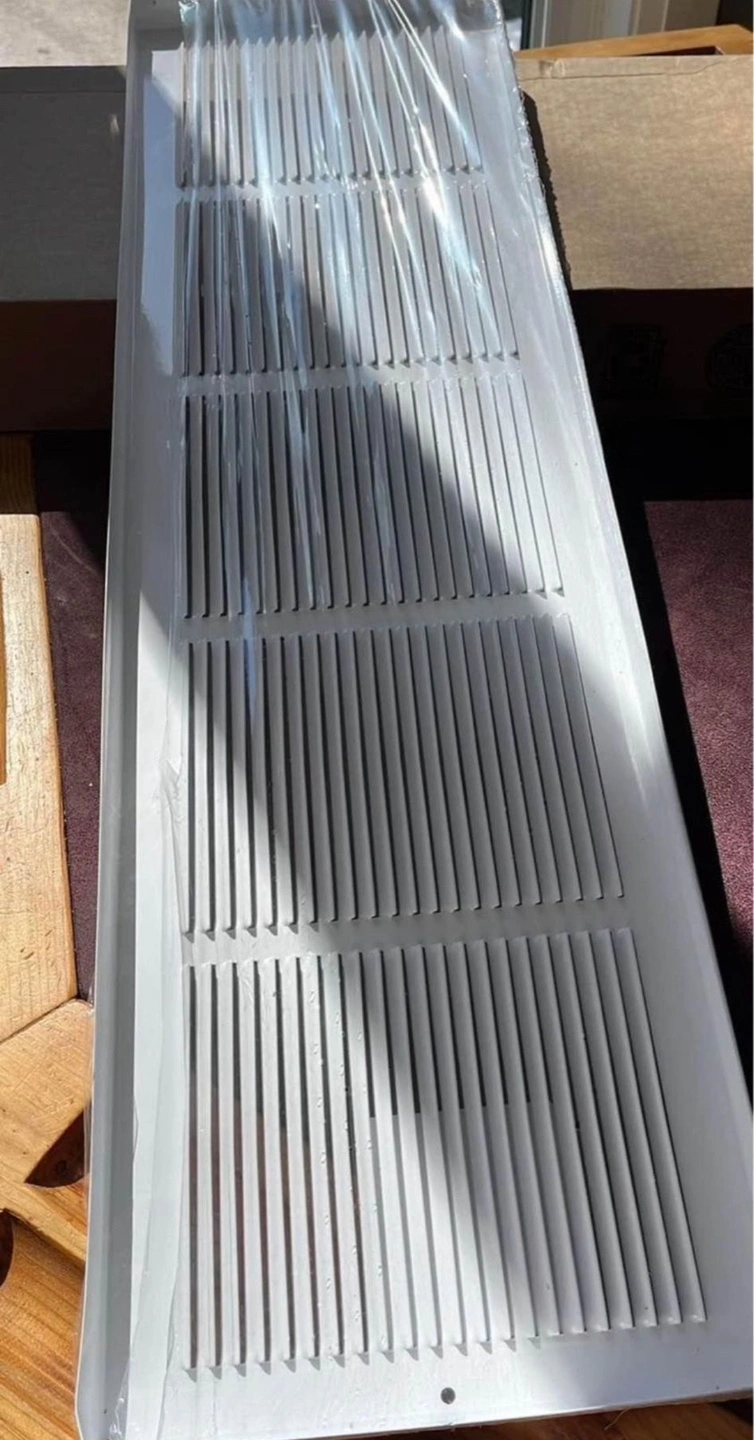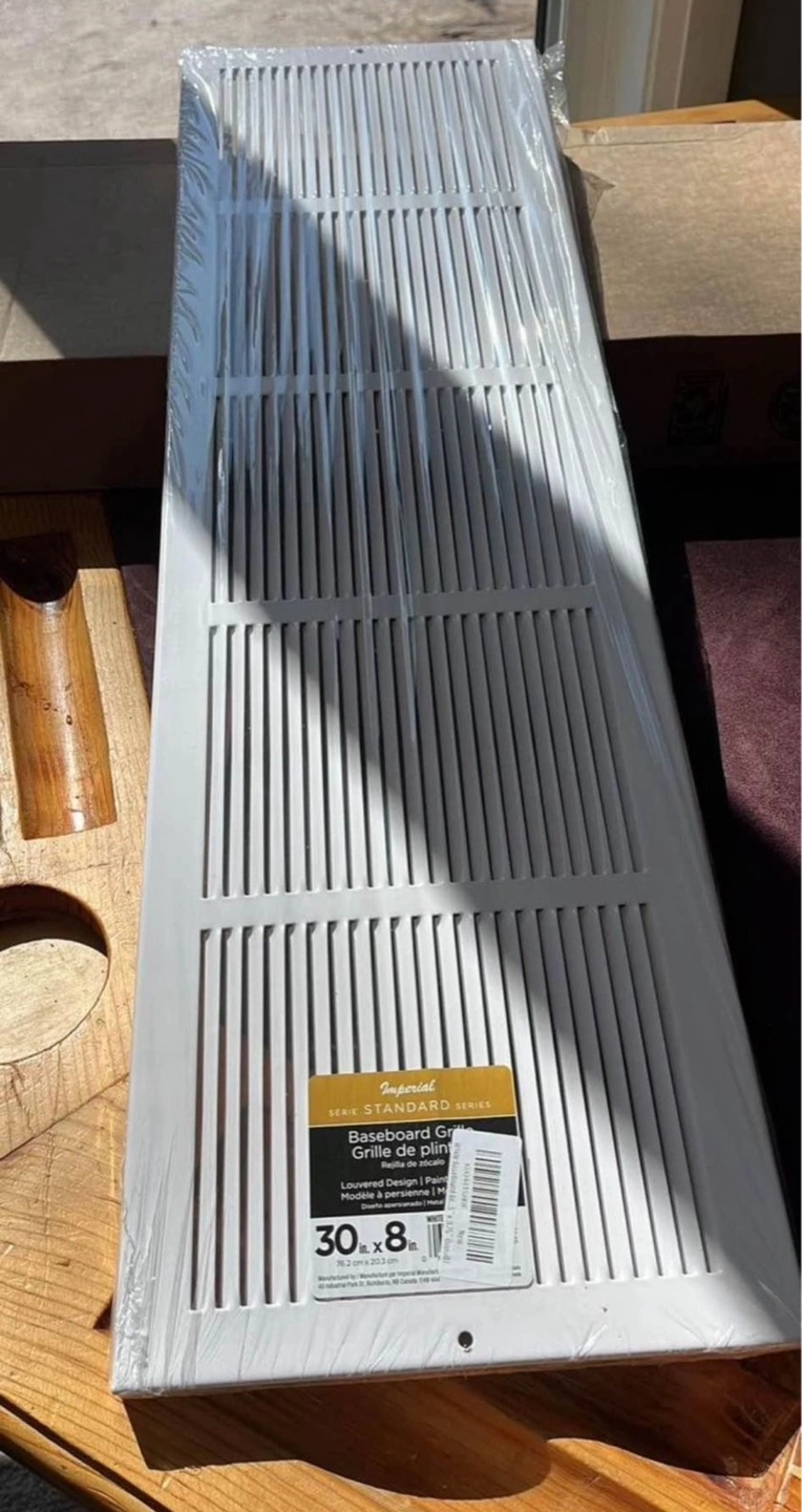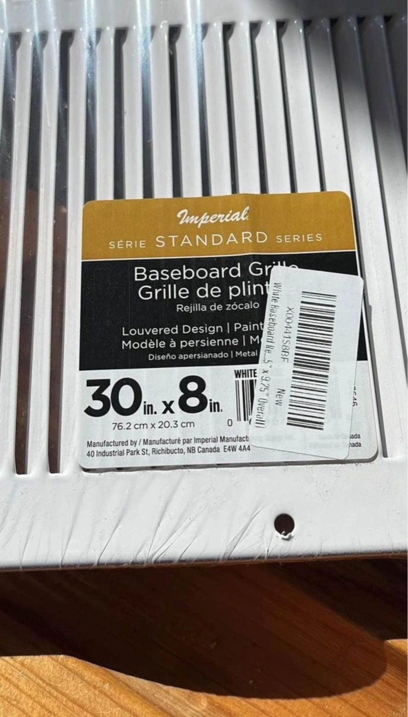 New in package. White metal baseboard grille. Louvered design. Measures 30" x 8". Manufactured in Canada.
