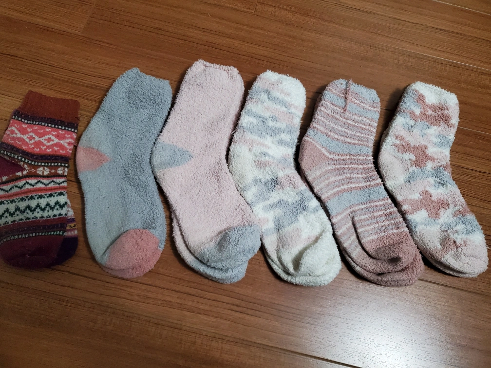 Six pairs of fuzzy socks. Various colours and patterns. Great for winter. One pair is a different style.
