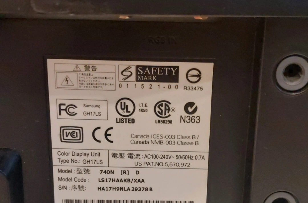 Used Samsung SyncMaster 740N monitor. Black. Good condition. Model LS17HAAKB/XAA.