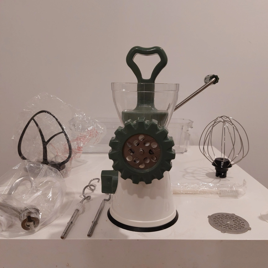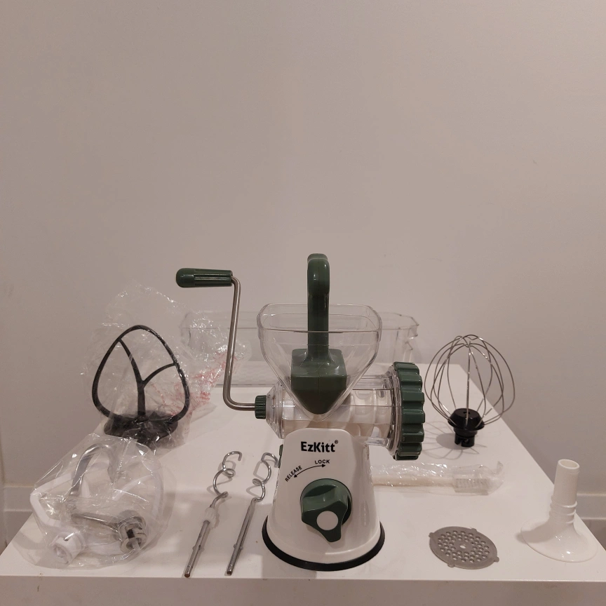 Brand new, never used. Includes meat grinder, whisk, dough hooks, and other attachments. Compact and easy to use. Great for small kitchens.