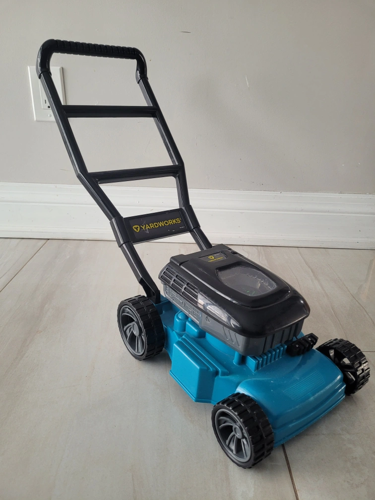 Super cute teal green and black plastic toy lawnmower. Features a push handle and realistic design. Suitable for children's imaginative play. Makes realistic lawn mower sound when you press button on top, or pull the starter handle. Asking $12 OBO.