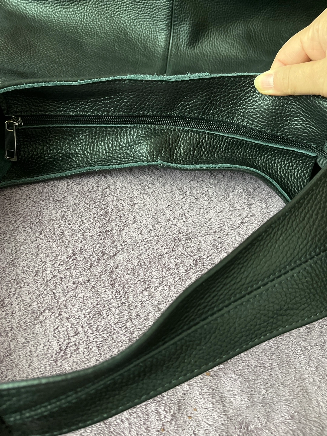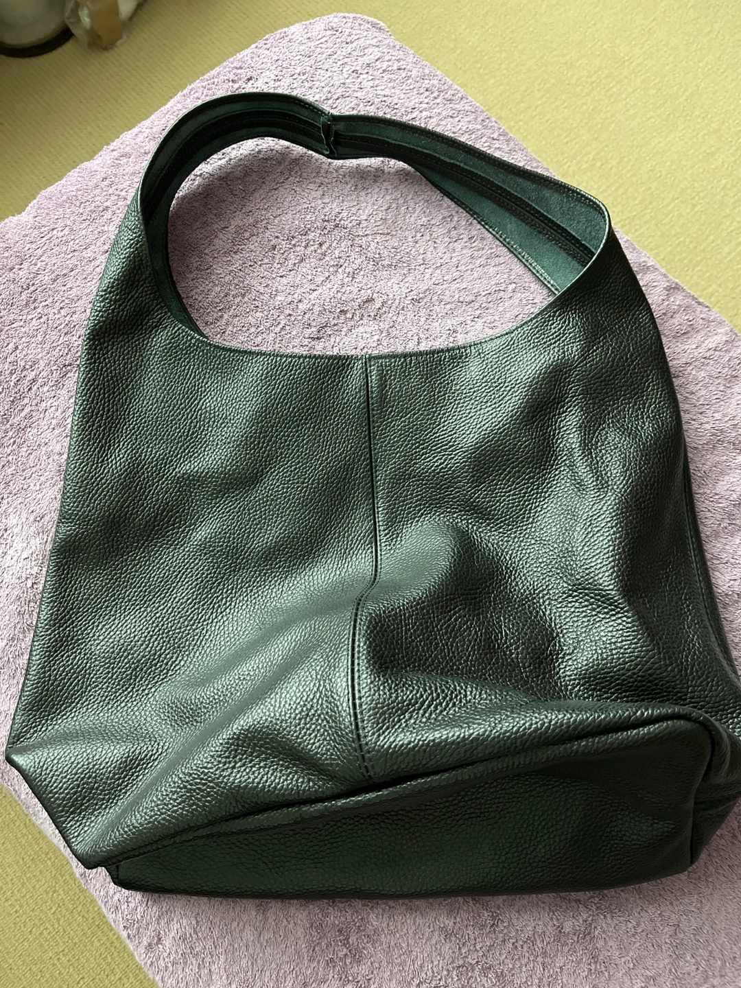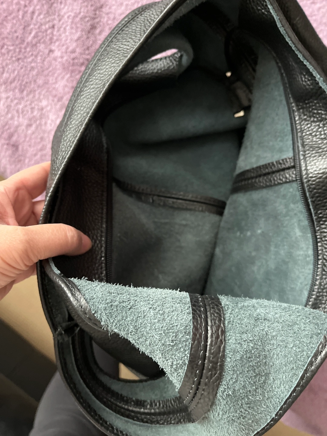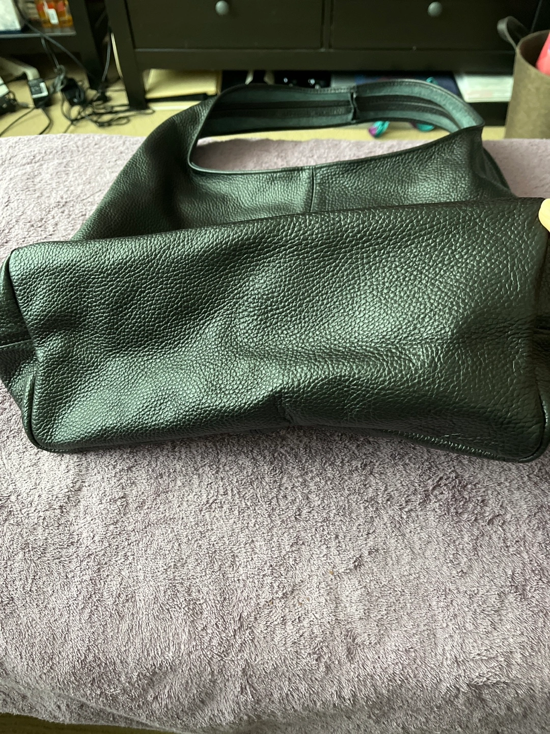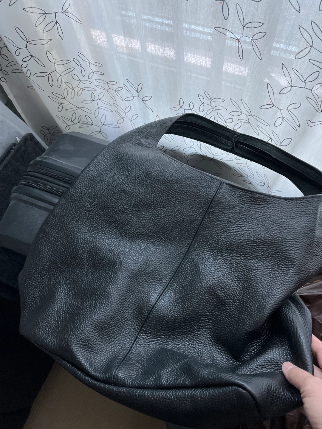 Large black leather hobo bag. Features a roomy interior and single shoulder strap. Good for everyday use. Pebbled leather exterior. Impulse buy from Portugal. Beautiful genuine leather. Never used. Paid 100 euros. Just trying to recoup costs. Added one more photo to show true black next to a black suitcase for the lighting made it look greenish but it’s definitely black.