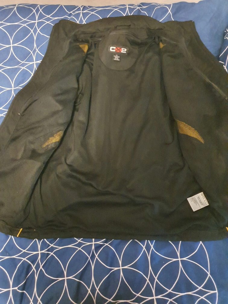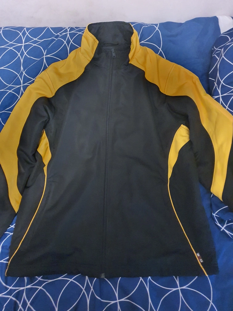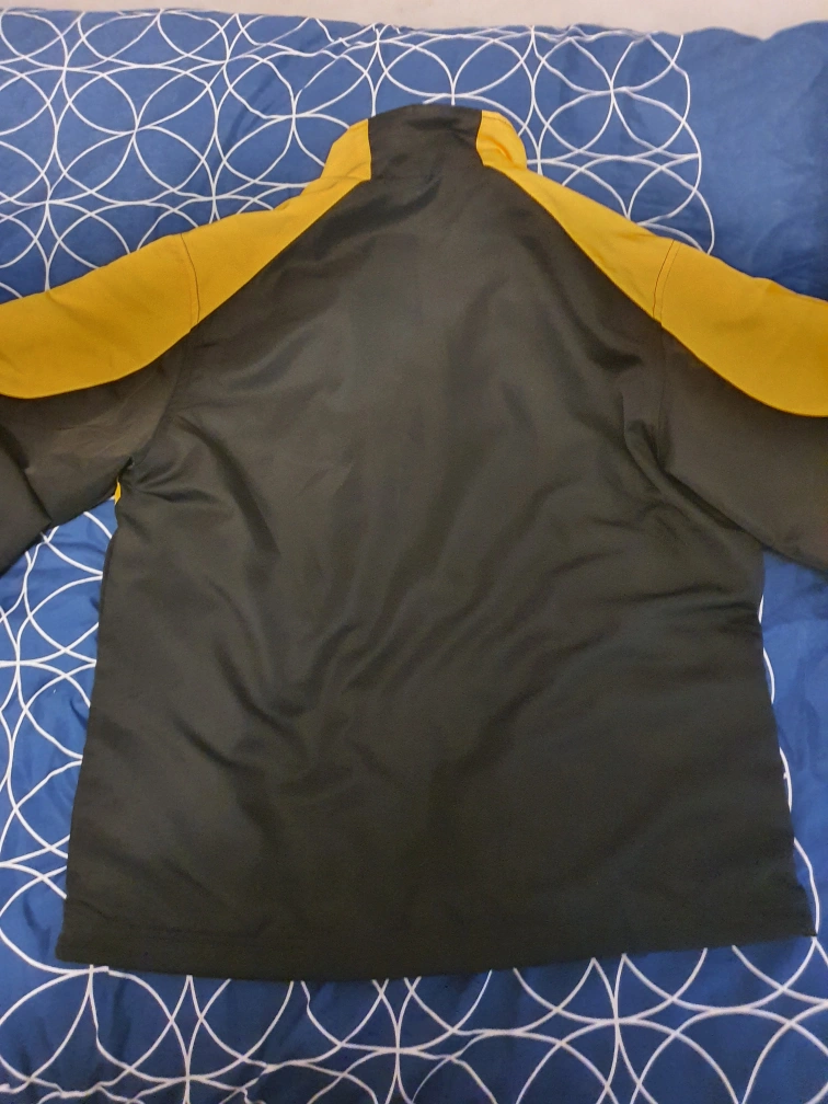 Men's black and gold jacket. Size small. Full zip. Mesh lining. Made in Bangladesh.