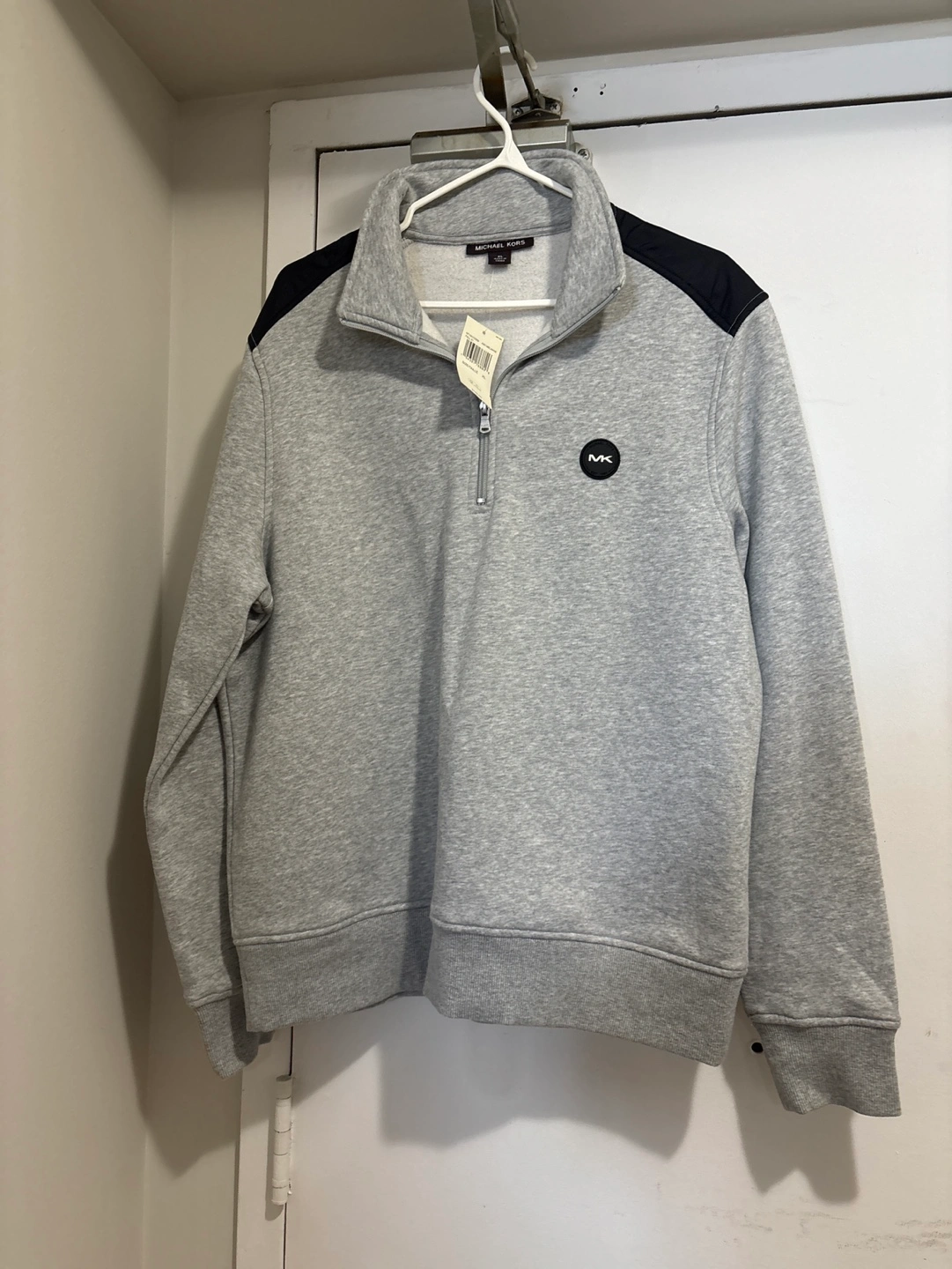 Grey quarter-zip sweatshirt. Features black shoulder accents and a small MK logo. Long sleeves, ribbed cuffs and hem. New with tags.