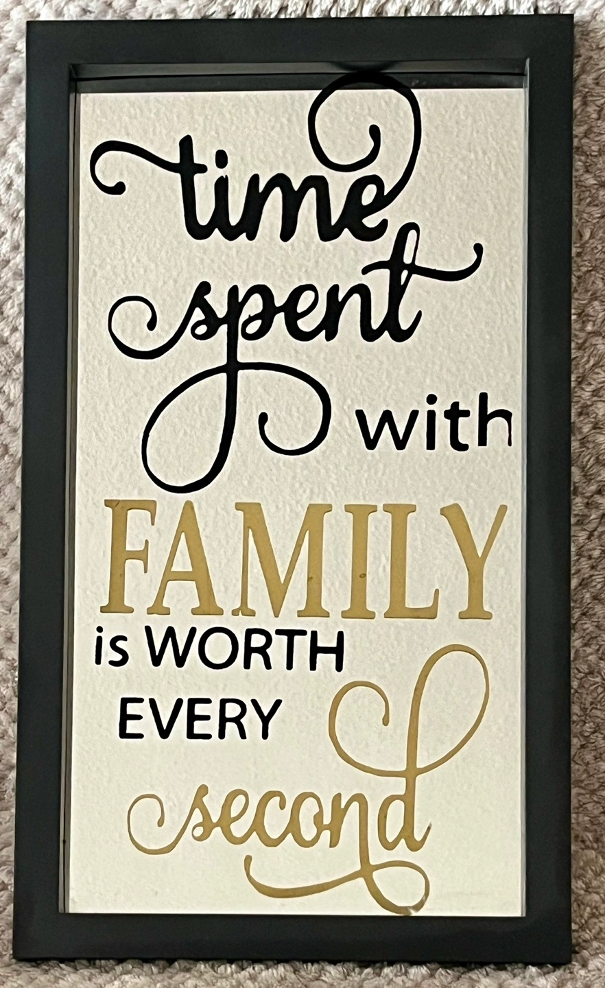 Brand New Black framed mirror wall decor. Features gold and black lettering. Says 'Time spent with family is worth every second'. Ready to hang.