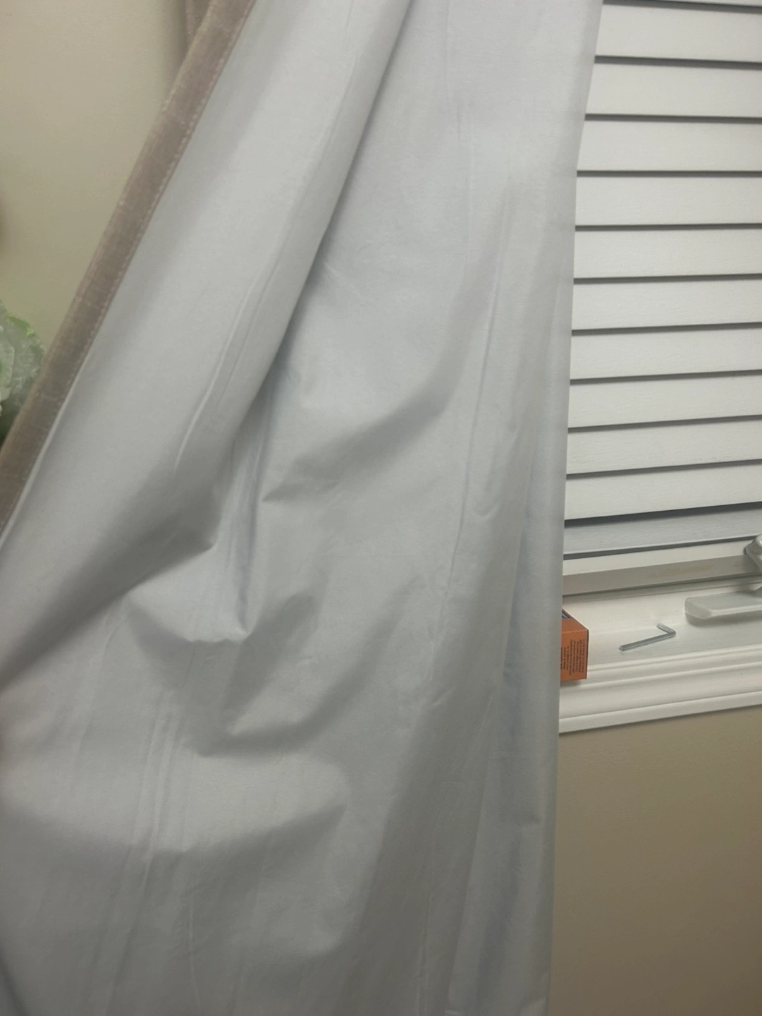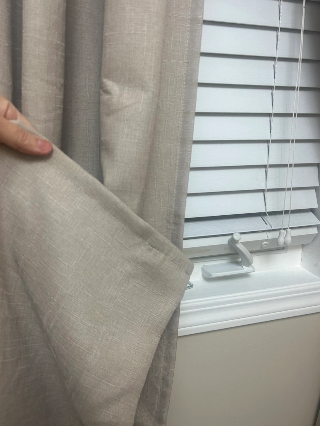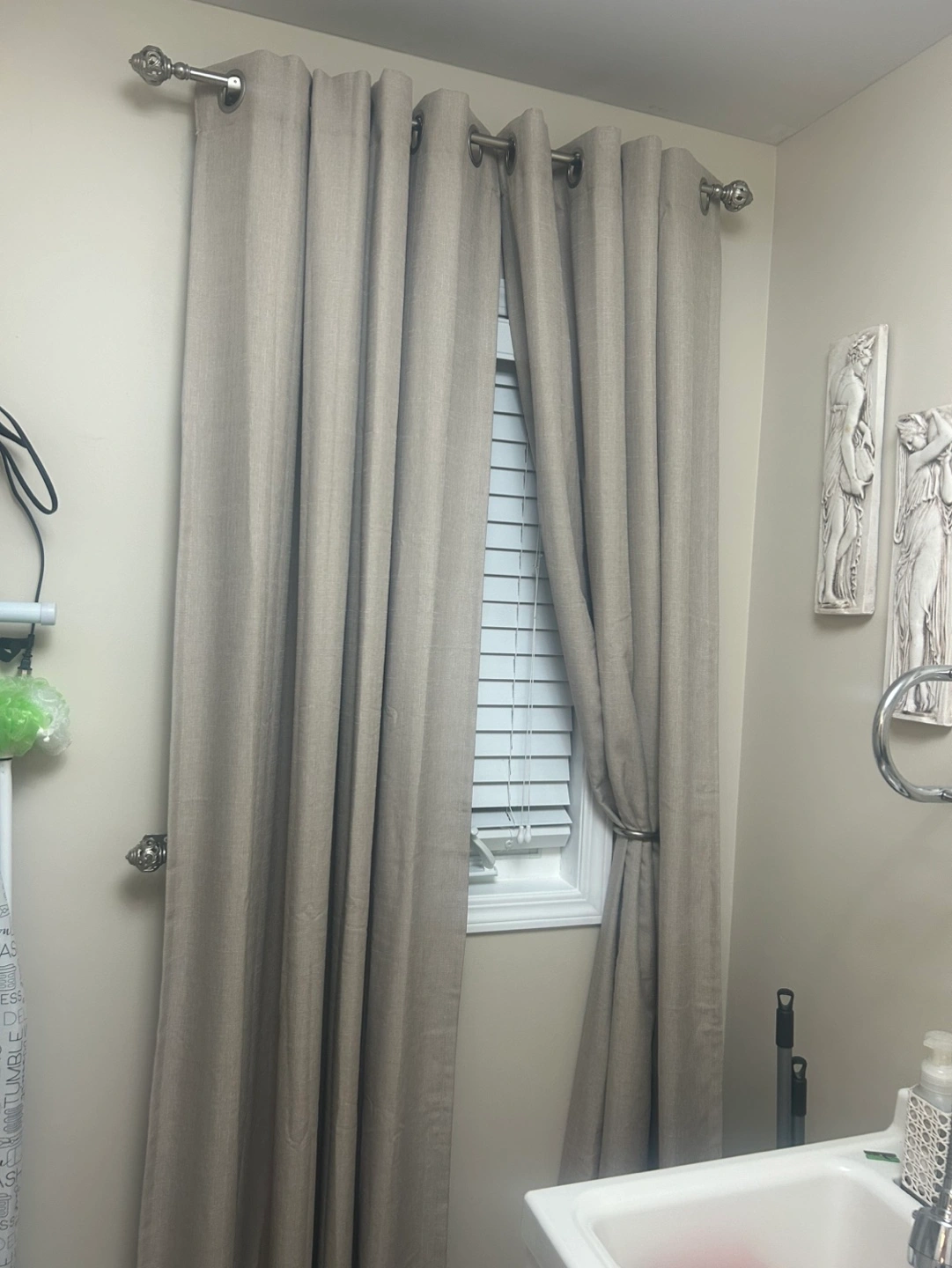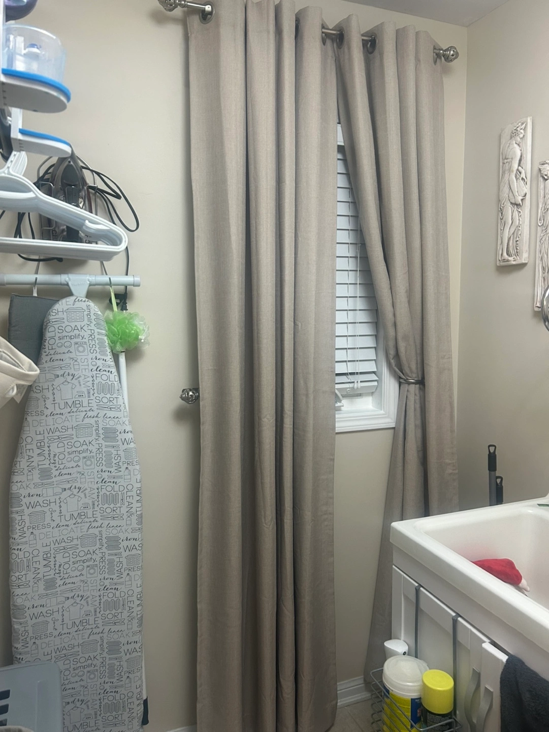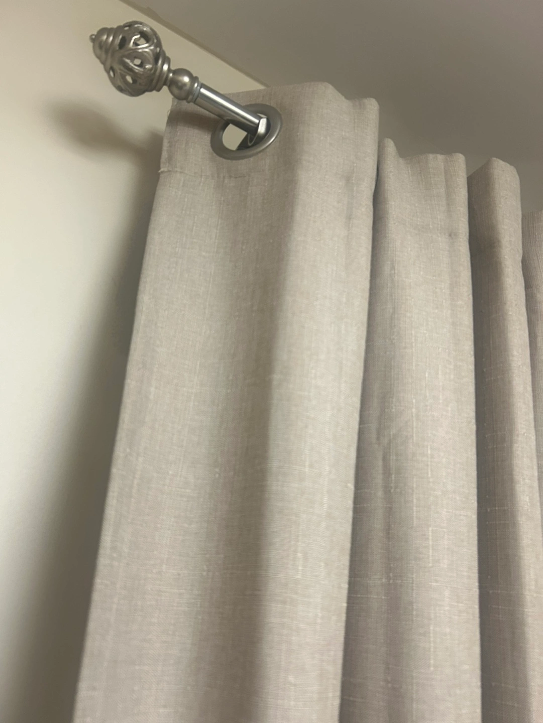 Pair of light beige curtains. Grommet top. Neutral colour. Good for laundry room or bedroom. Linen look. Blackout