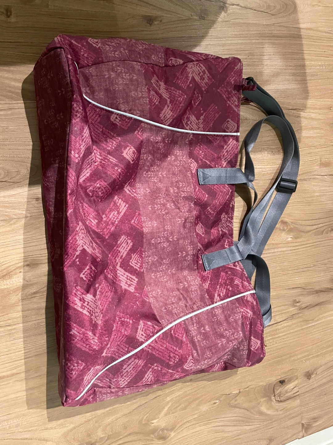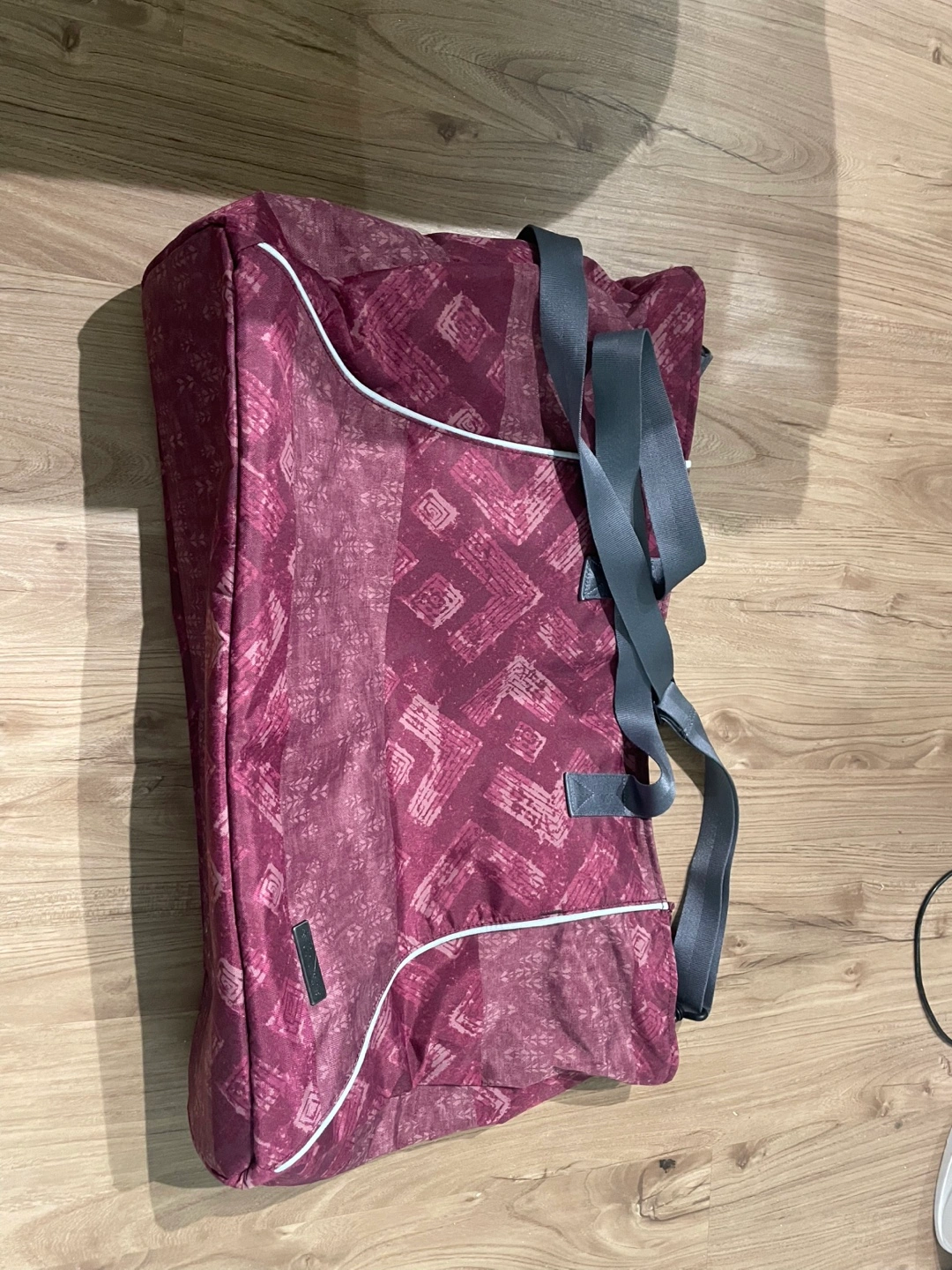 Large maroon tote bag. Features multiple compartments and long shoulder straps. Great for gym, travel or everyday use. Has a compartment for a yoga mat