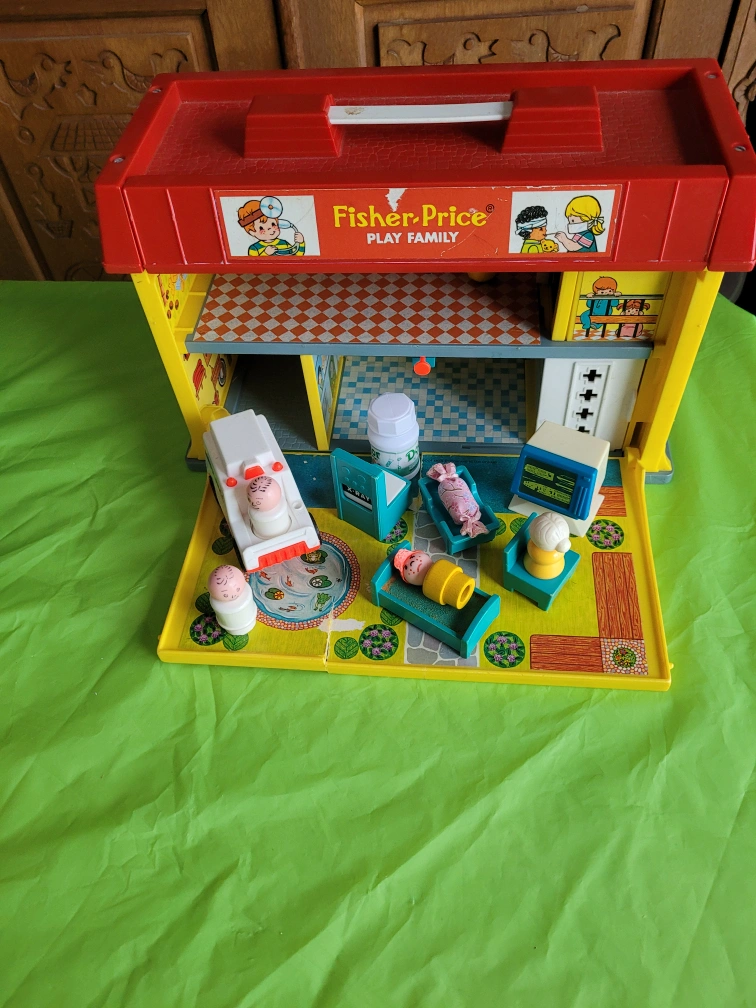 Show allVintage Fisher-Price Play Family doctor's office playset. Includes building, ambulance, and several figures. Great collectible! 1976