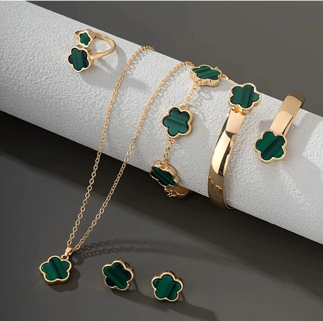 Each set 8CAD, take all 2 colors for 14CAD Beautiful jewellery set. Includes necklace, bracelet, ring, and earrings. Features gold-toned metal and flower-shaped accents. Available in black, green, or white. Smoke free and pet free home Kindly note all sales are final and no return or refund Please check my other listings aswell😊