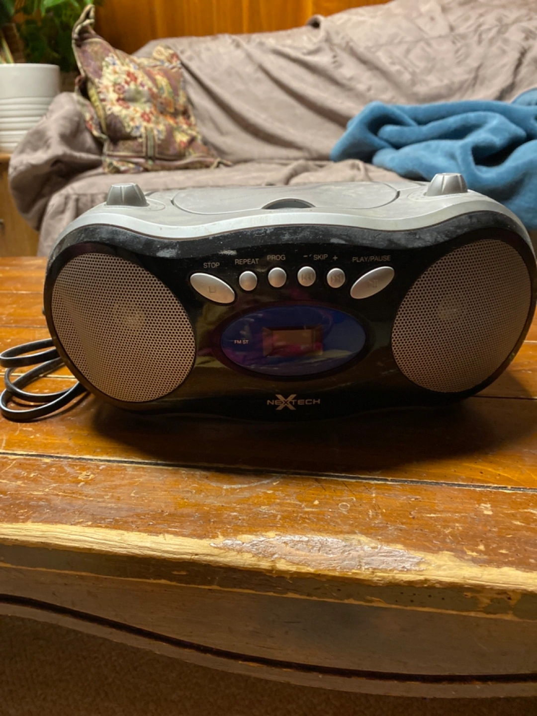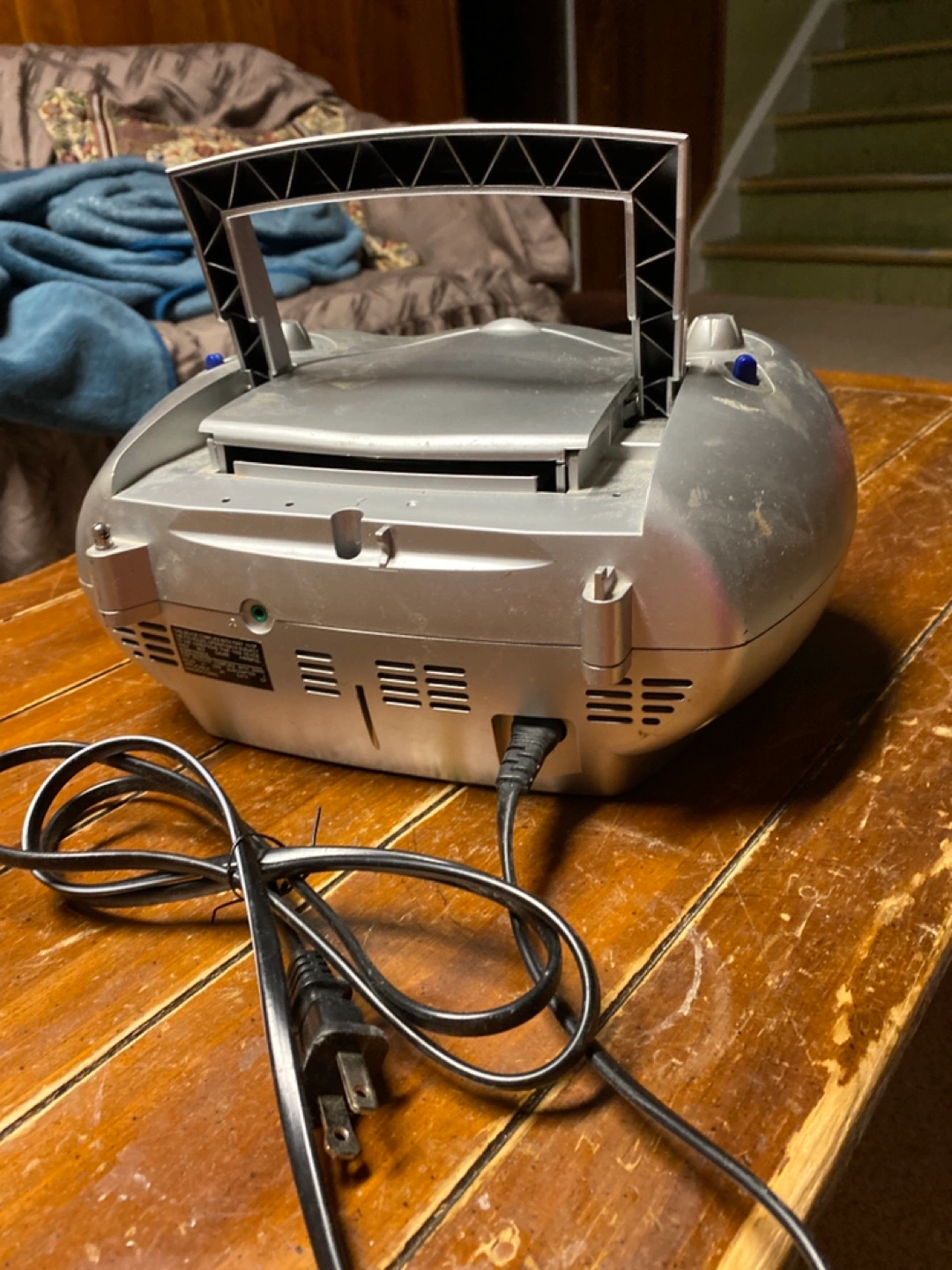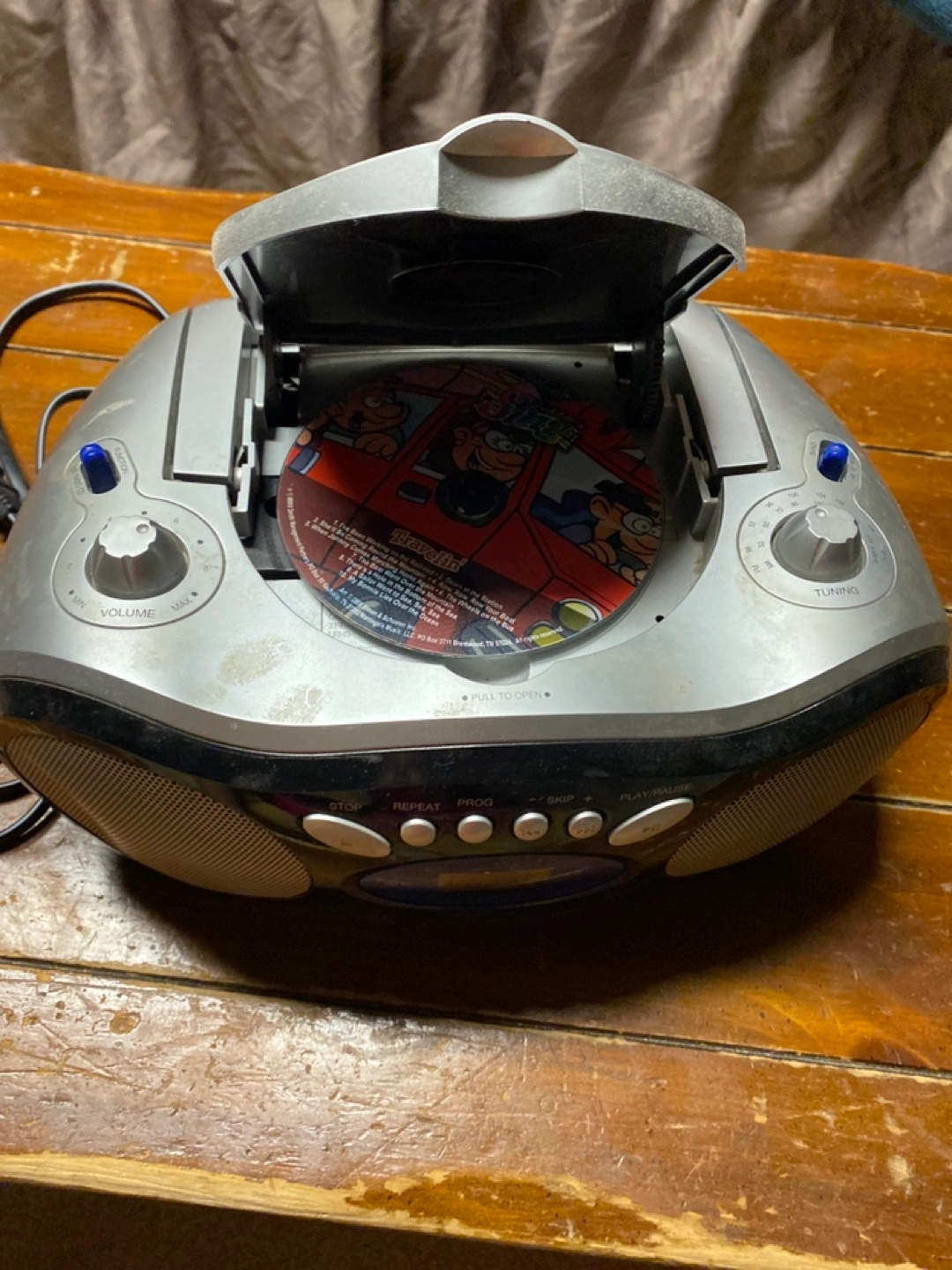 Portable CD player. Plays CDs and radio. Features volume and tuning knobs. Includes power cord. Compact and easy to carry.