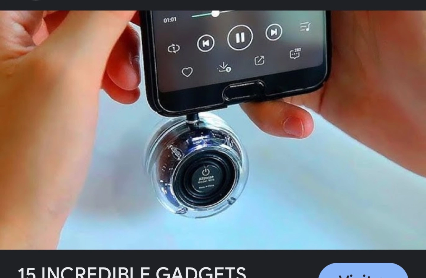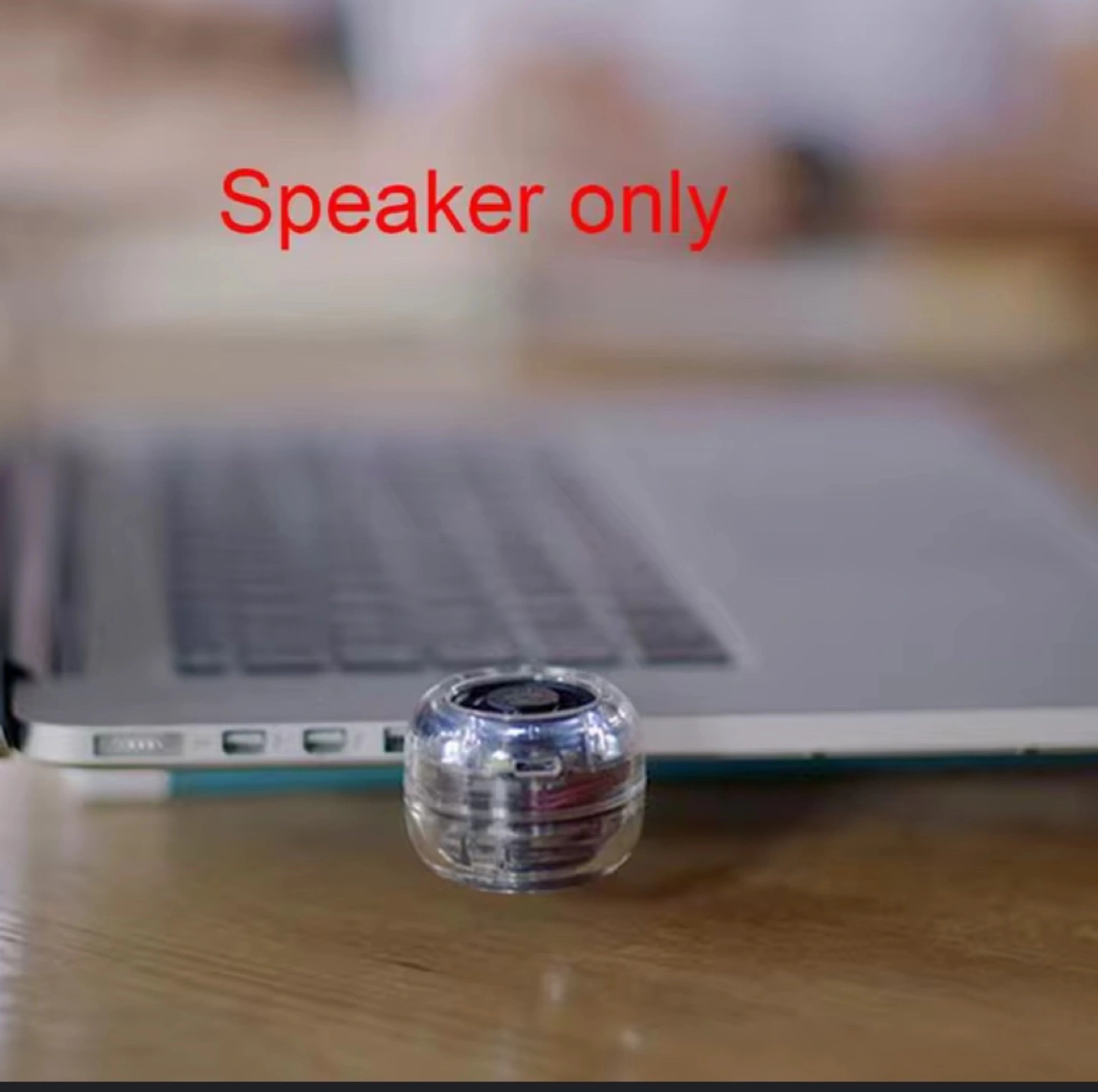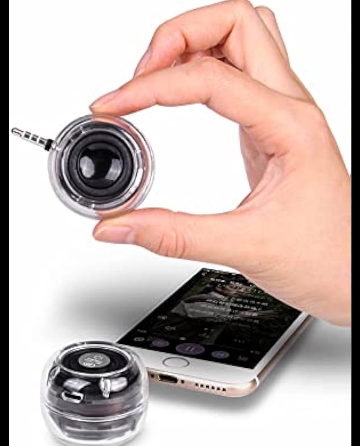 Small, round speaker. Connects via aux cable. Transparent casing. Compact and portable design. Ideal for travel.