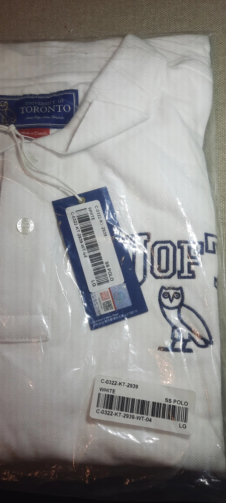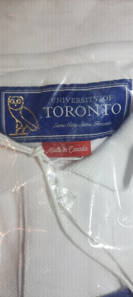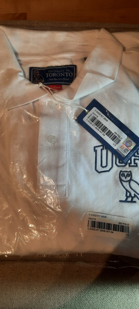 Limited edition from 2022. Brand new with tags. White polo shirt. Large size. University of Toronto and October's Very Own branding. Made in Canada. Remaining versions of this shirt sell for over $120+ https://stockx.com/ovo-u-of-t-pique-polo-navy