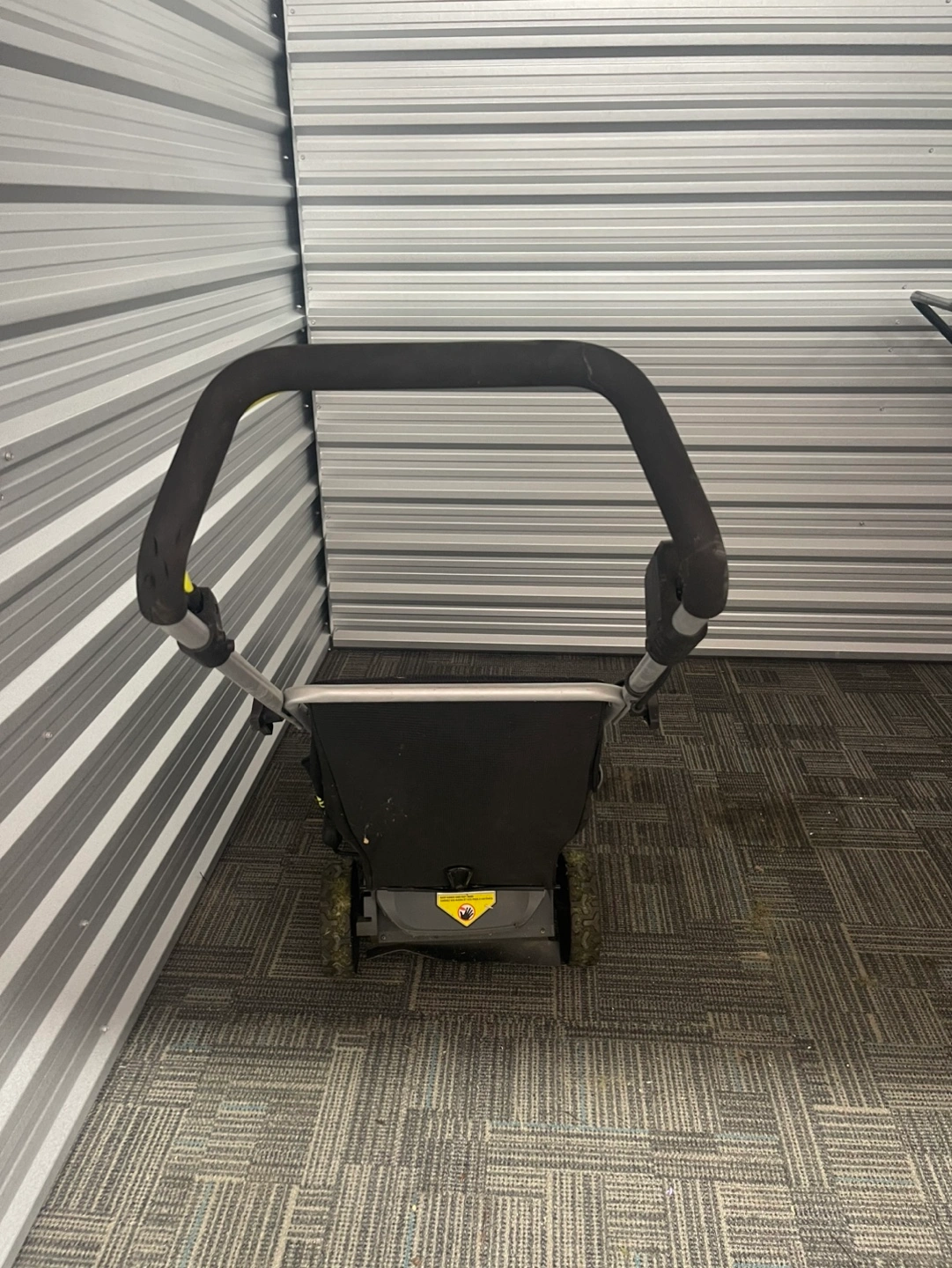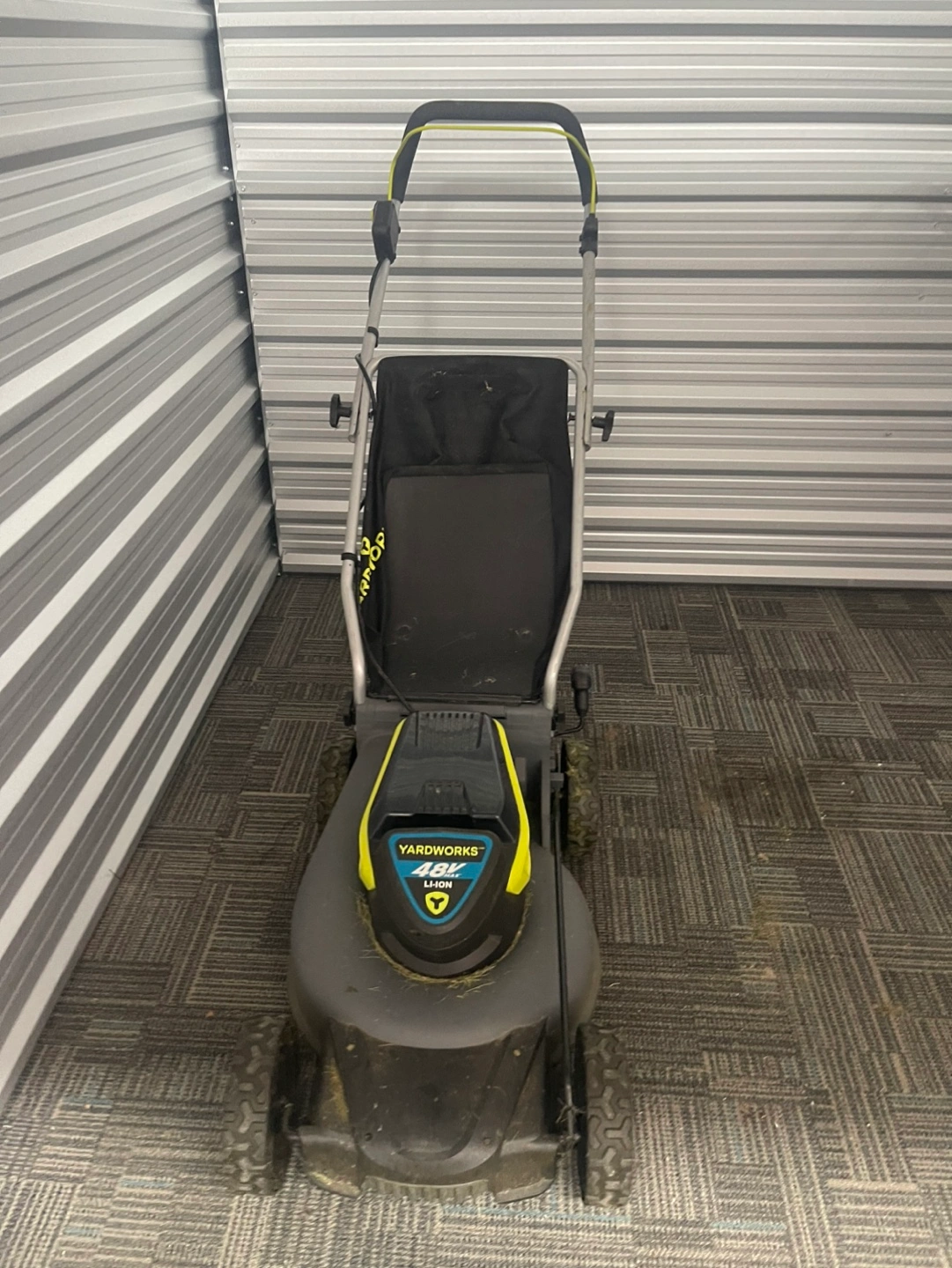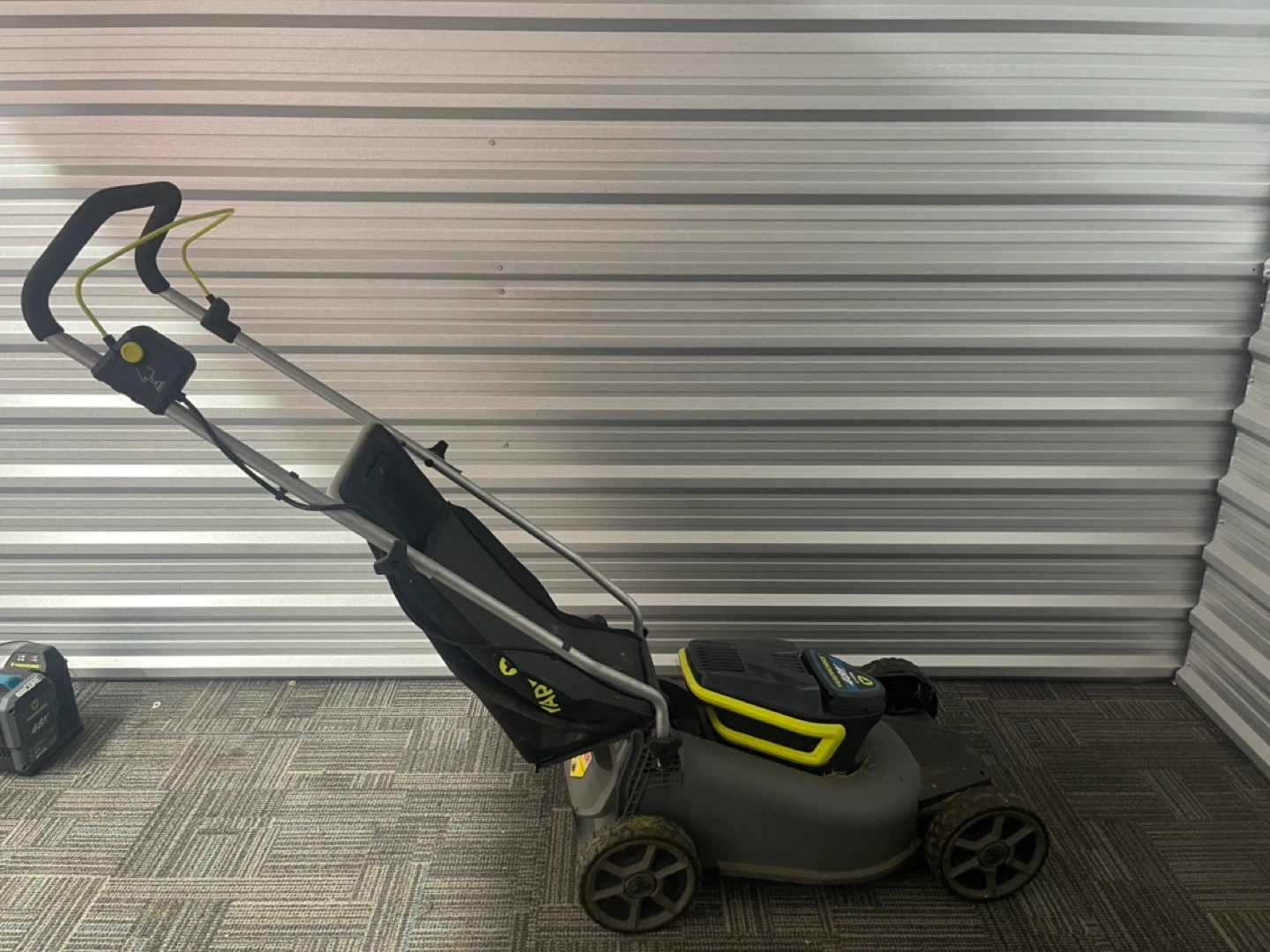 Cordless lawn mower. Grey and yellow. Li-ion battery. Folding handle. Four wheels. Used, working condition.