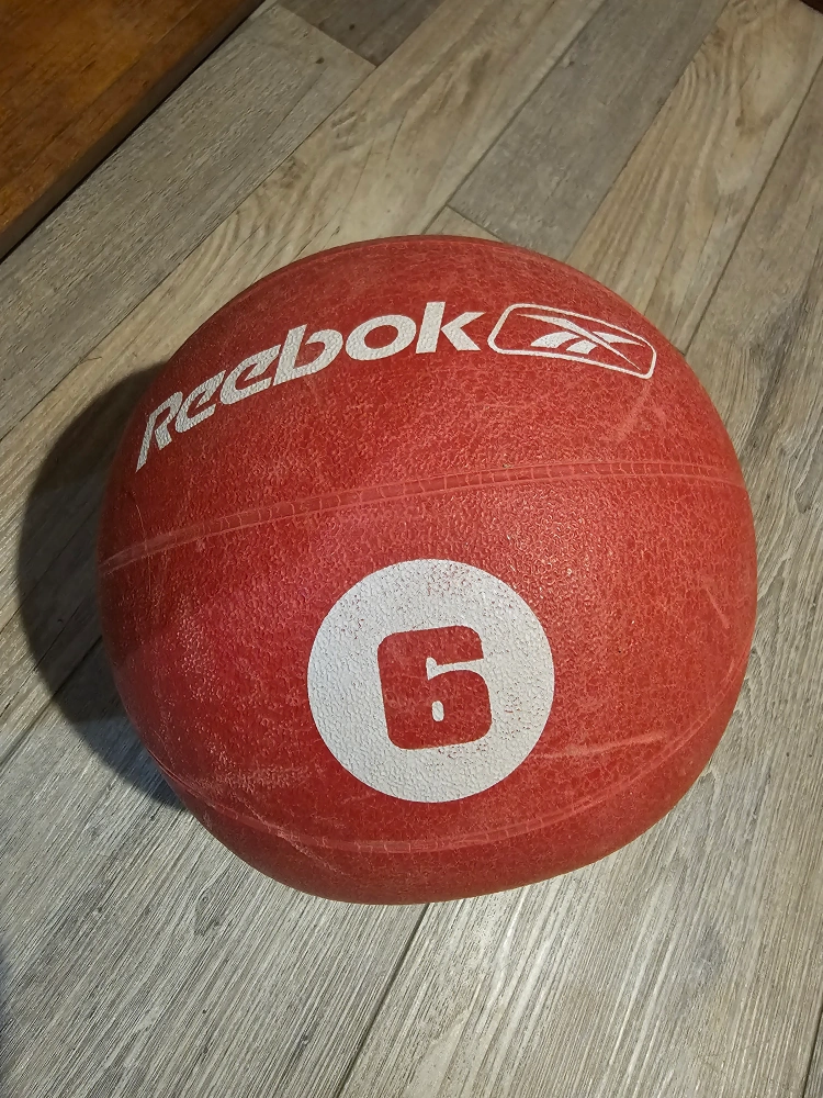 Red Reebok medicine ball. Number 6. Shows some wear but will work for what you need it.