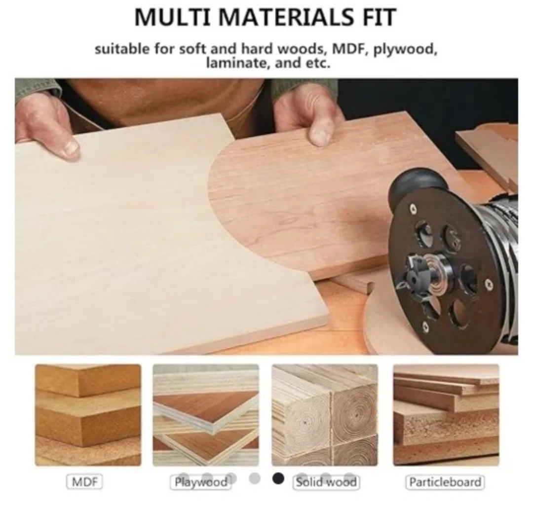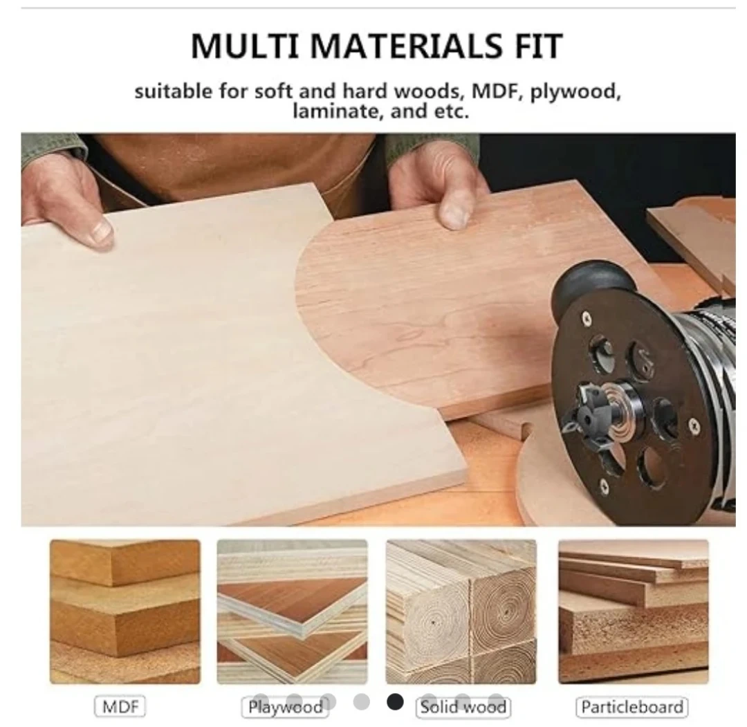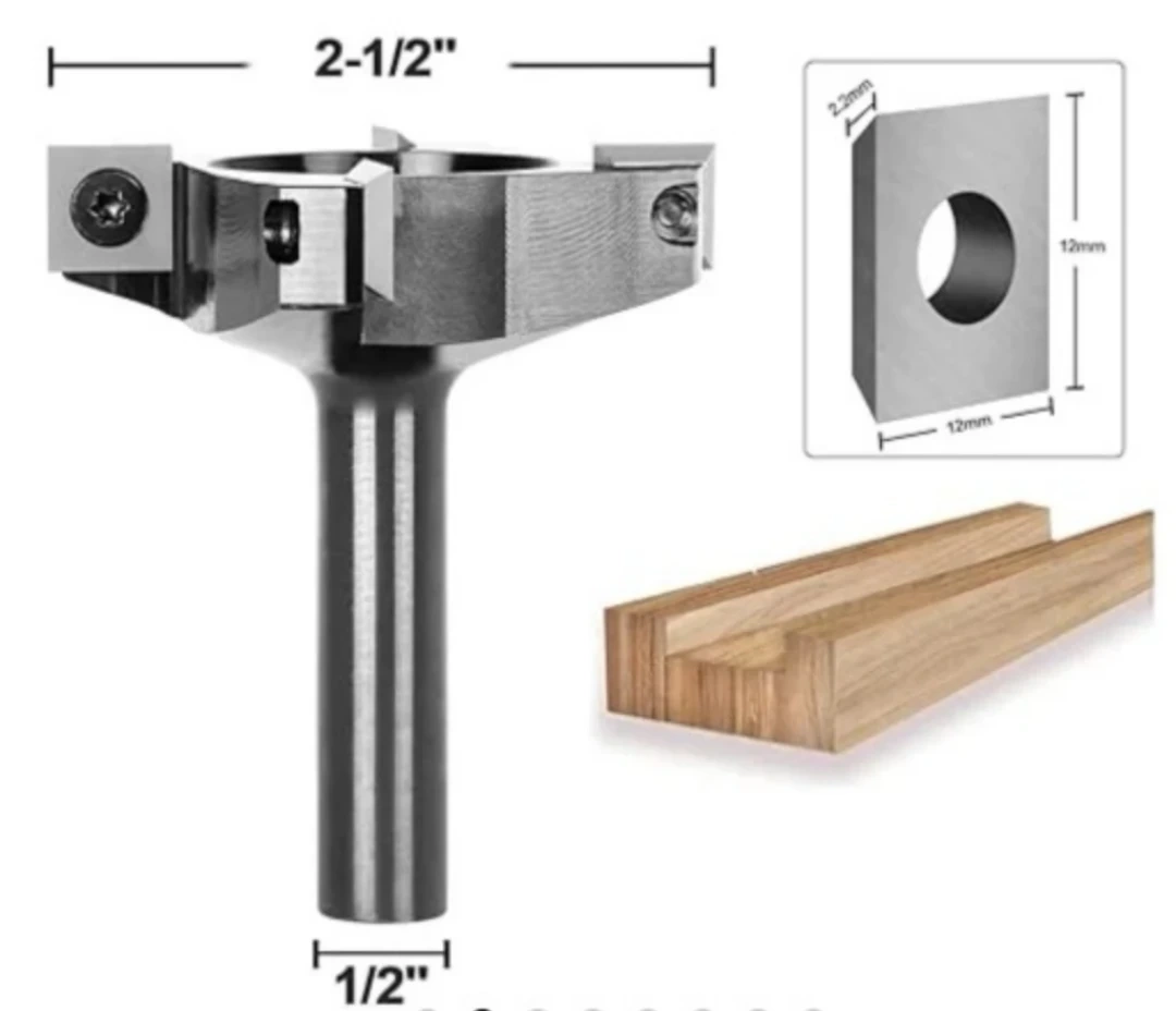 Router bit, 2-1/2" diameter, 1/2" shank. Suitable for various materials including hardwoods, softwoods, MDF, plywood, and laminate. Creates a round-over edge profile. Metal construction.