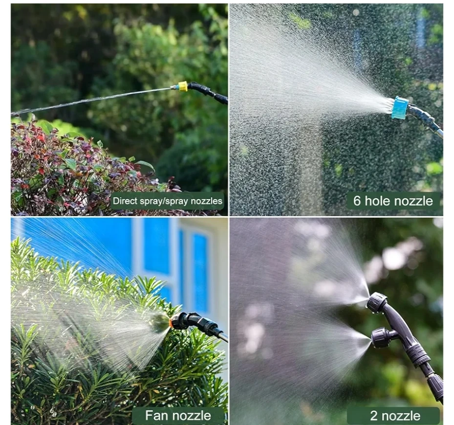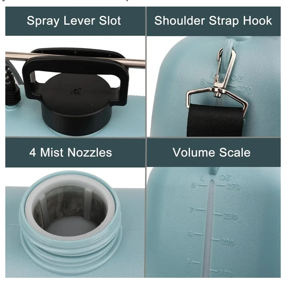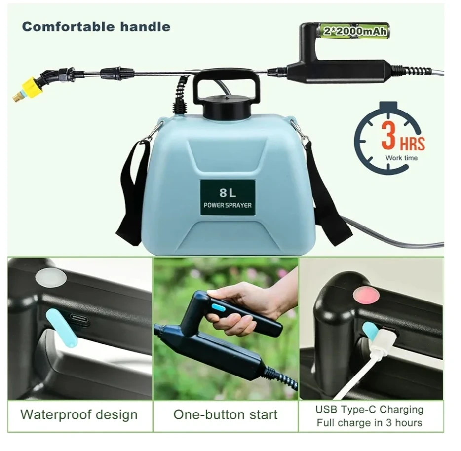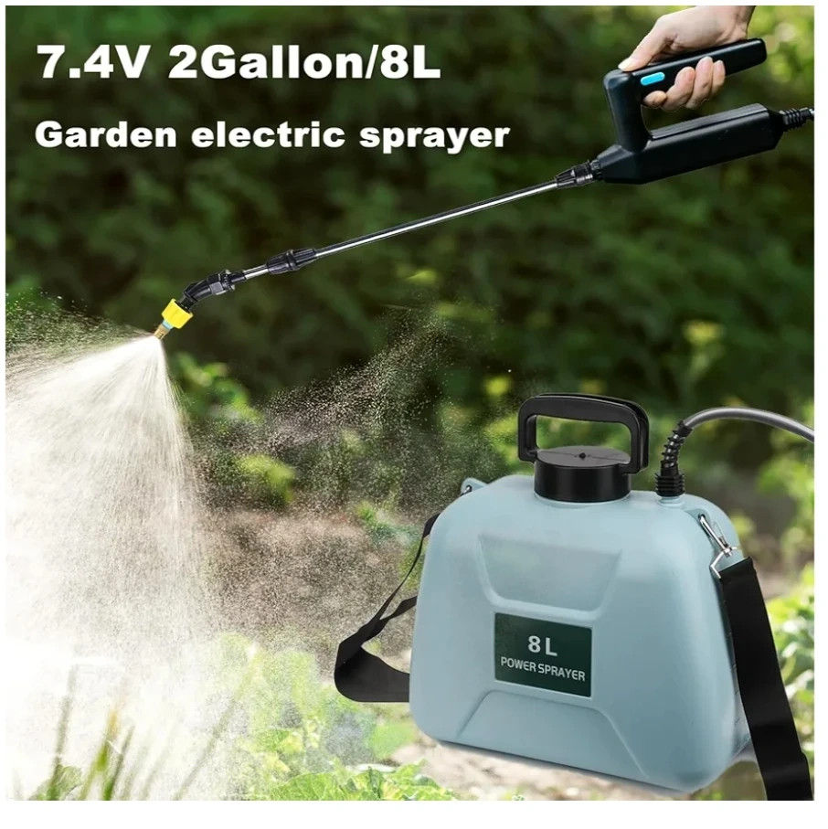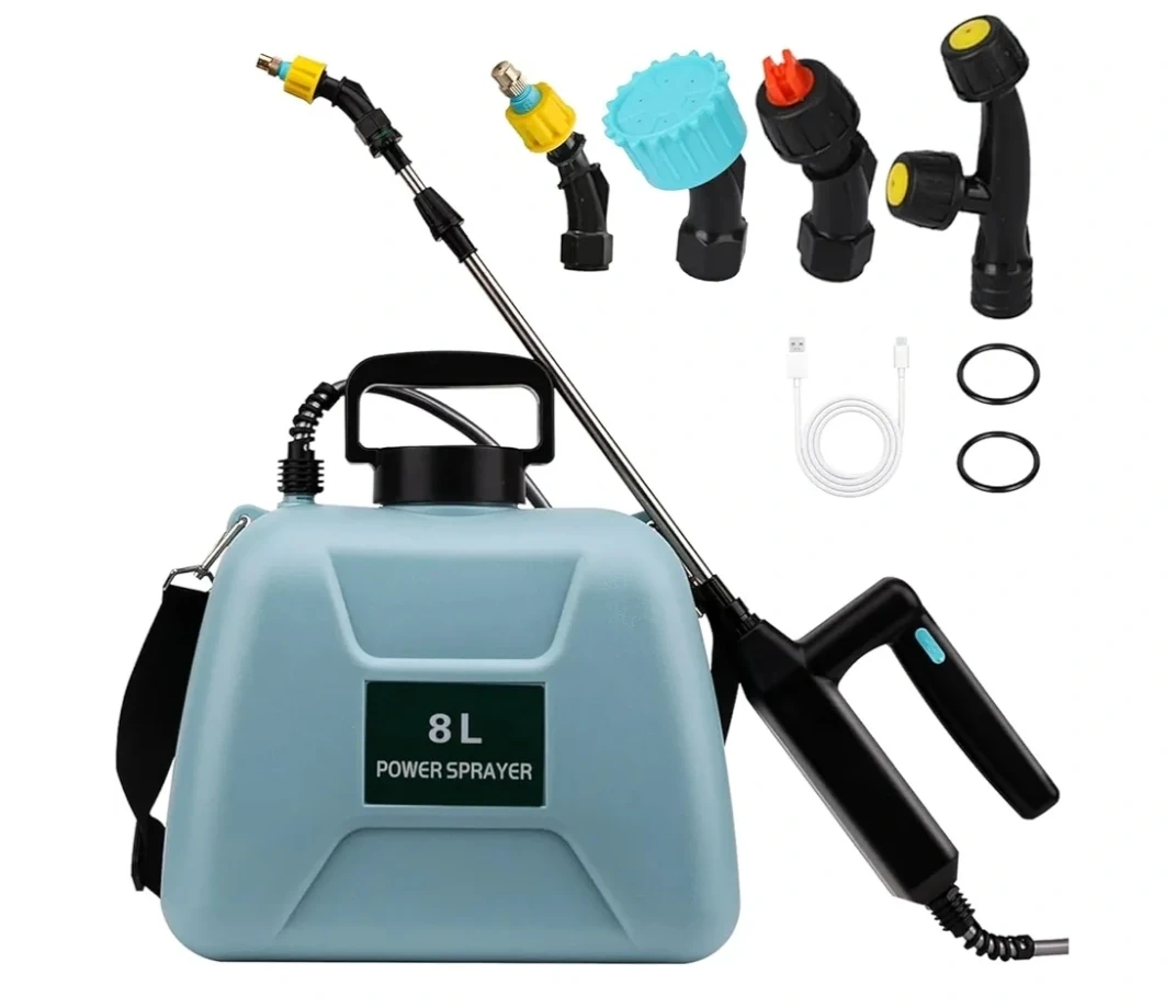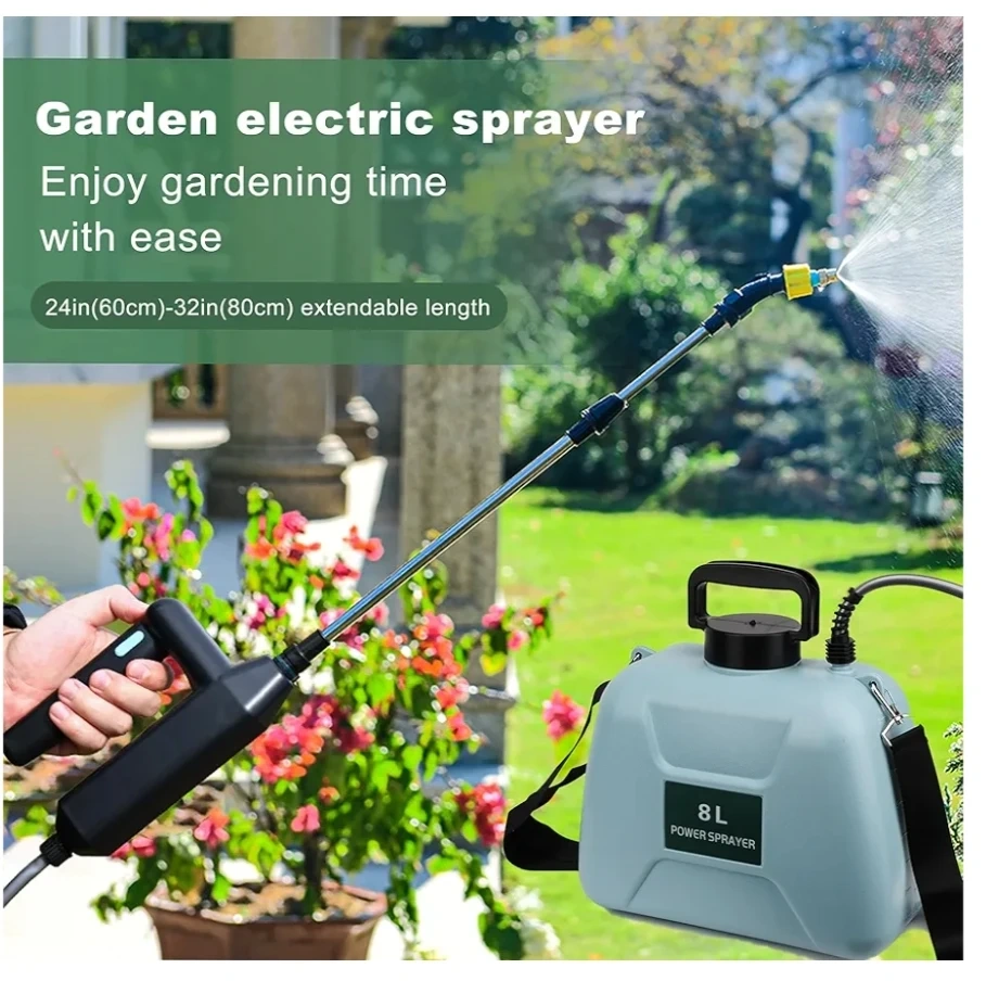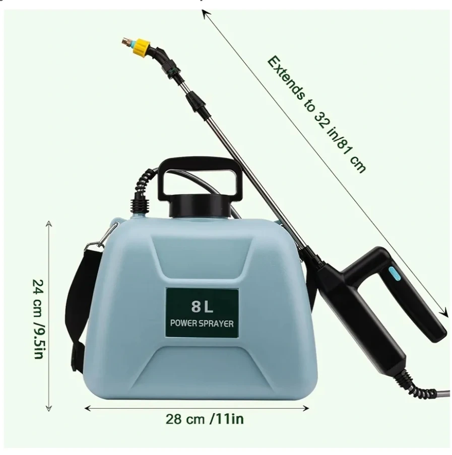 Cordless power sprayer, 8 litre capacity. Features adjustable wand extending to 81 cm. Multiple nozzle options included. Rechargeable battery with 3 hour run time. Includes shoulder strap for comfortable carrying.