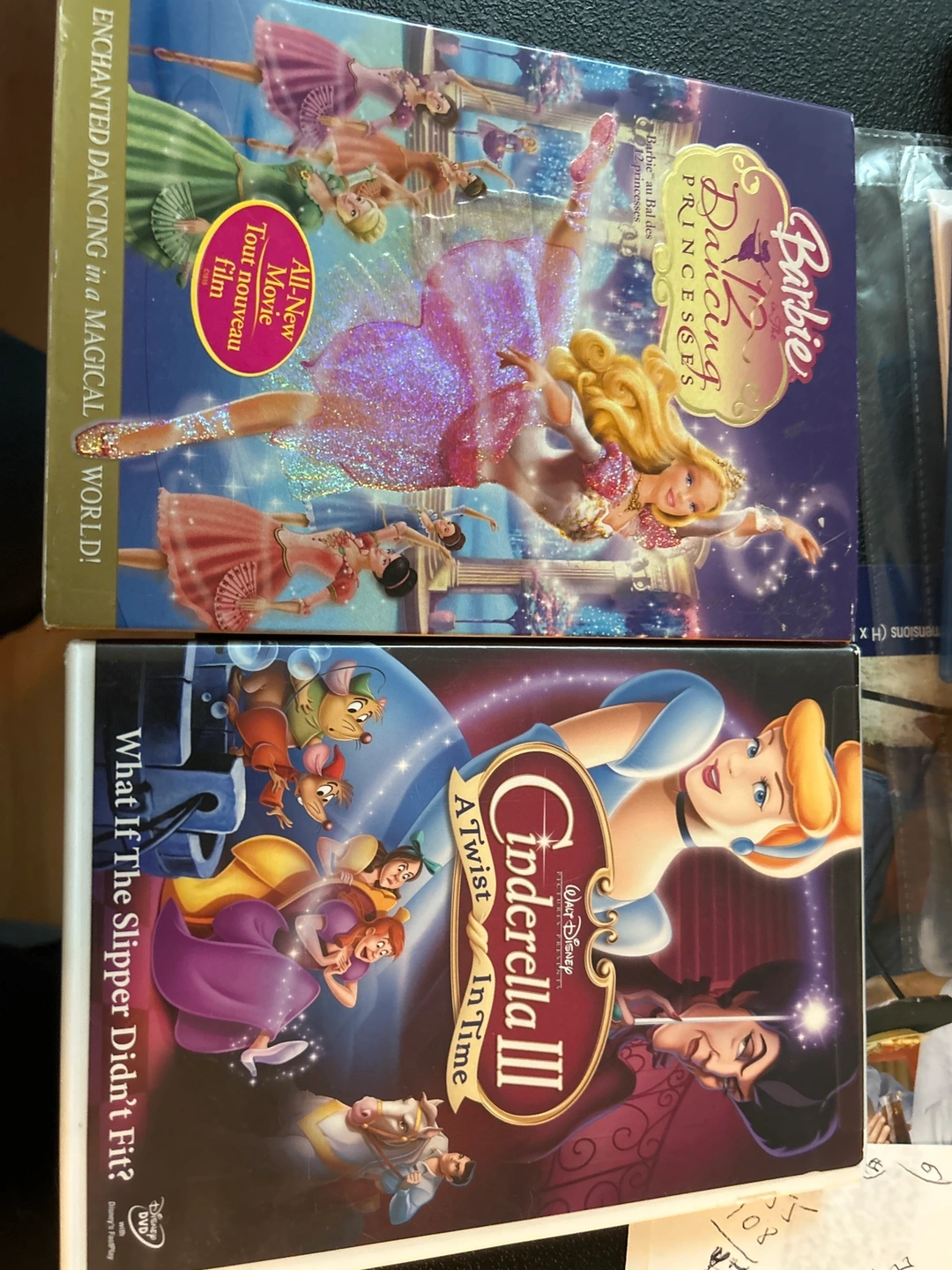 Two DVDs: Barbie 12 Dancing Princesses and Cinderella III. Both movies appear to be in great condition.