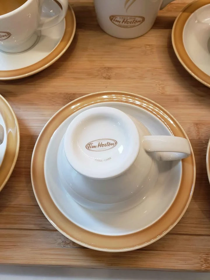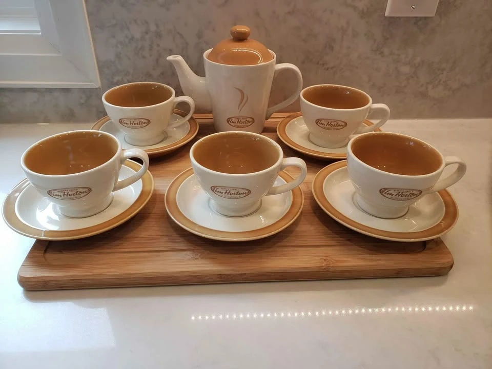 Vintage Tim Hortons tea set. Includes six cups and saucers and a teapot. Cream and brown colour scheme. Perfect for collectors or Tim Hortons enthusiasts. One plate has a small chip at the bottom as seen in the picture.