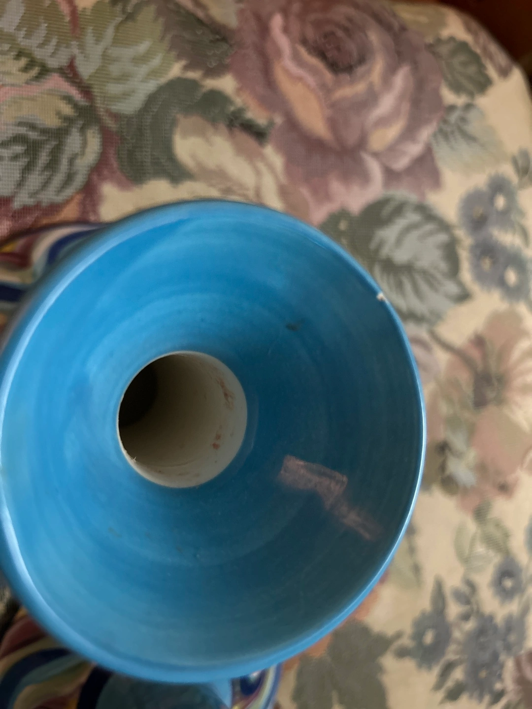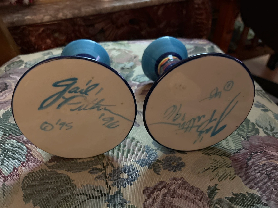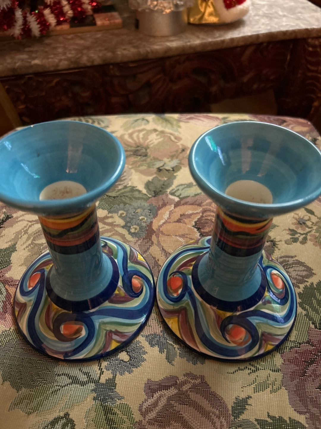 Set of two unique candle holders. Features vibrant colours and swirling designs. Hand-painted details. Adds a touch of artistry to your home décor. One very small chip on one candle holder