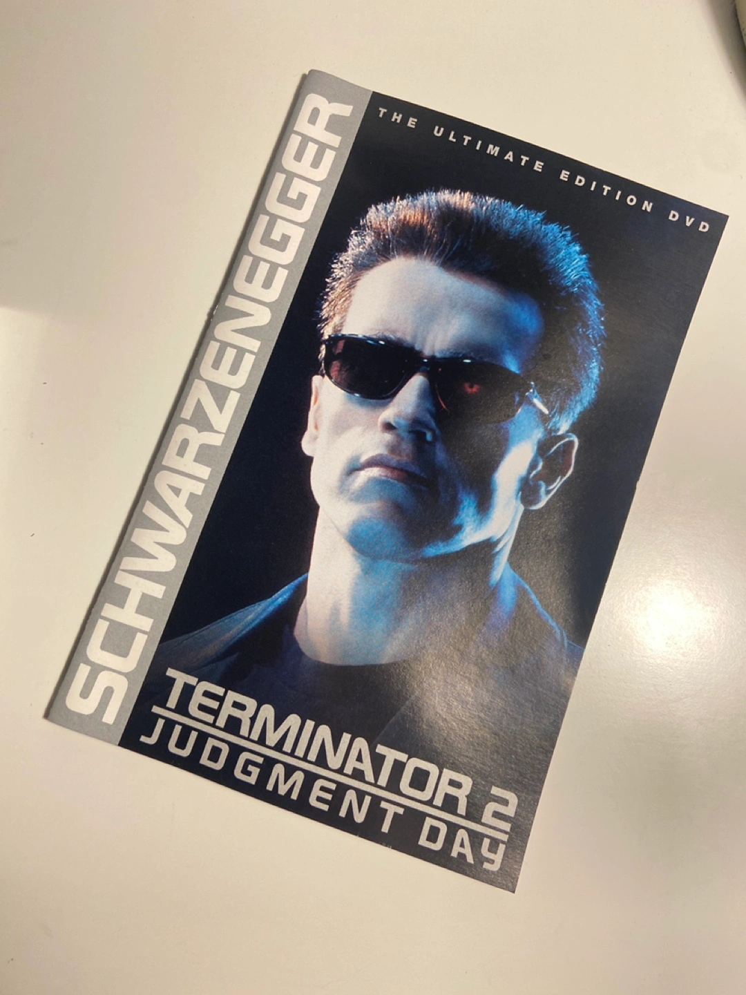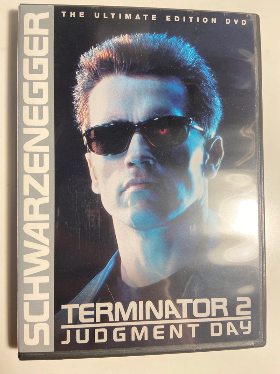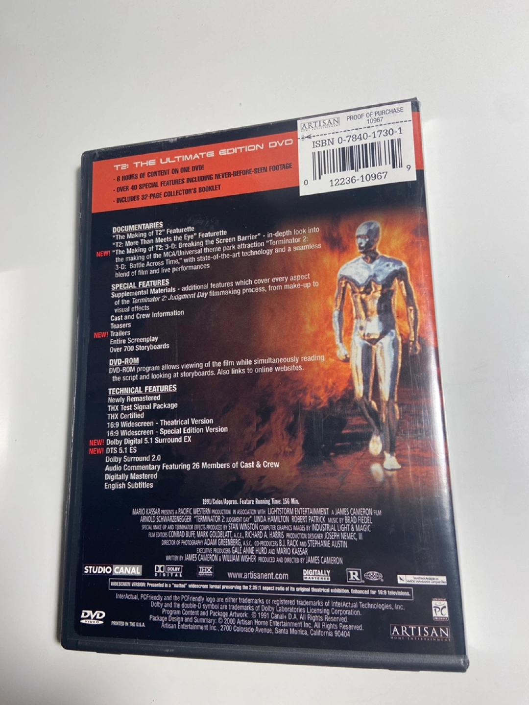 Ultimate edition DVD of Terminator 2: Judgment Day. Features over 40 special features never before seen footage. Includes 32-page collector's booklet. DVD-ROM features allow viewing of the film while simultaneously reading. THX certified. Looks great on any bookshelf, also great for terminator fans. Will give discount if you give me your best Terminator impression.