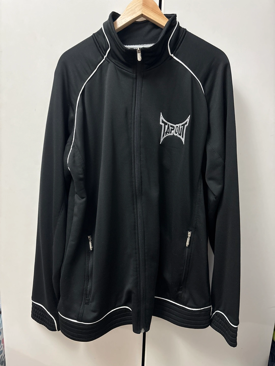 Black zip-up track jacket. Features white piping detail and Tapout logo. Long sleeves, two zippered pockets.