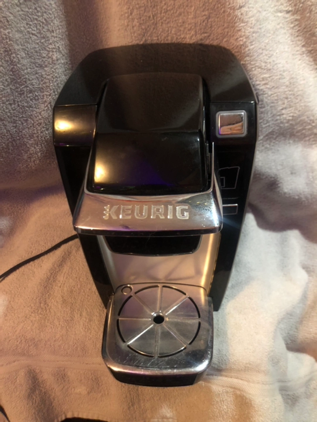 Black and silver Keurig K10 coffee maker. Compact design, perfect for small spaces. Makes single-serve cups of coffee. Willing to meet up, drop off, or porch pick up.