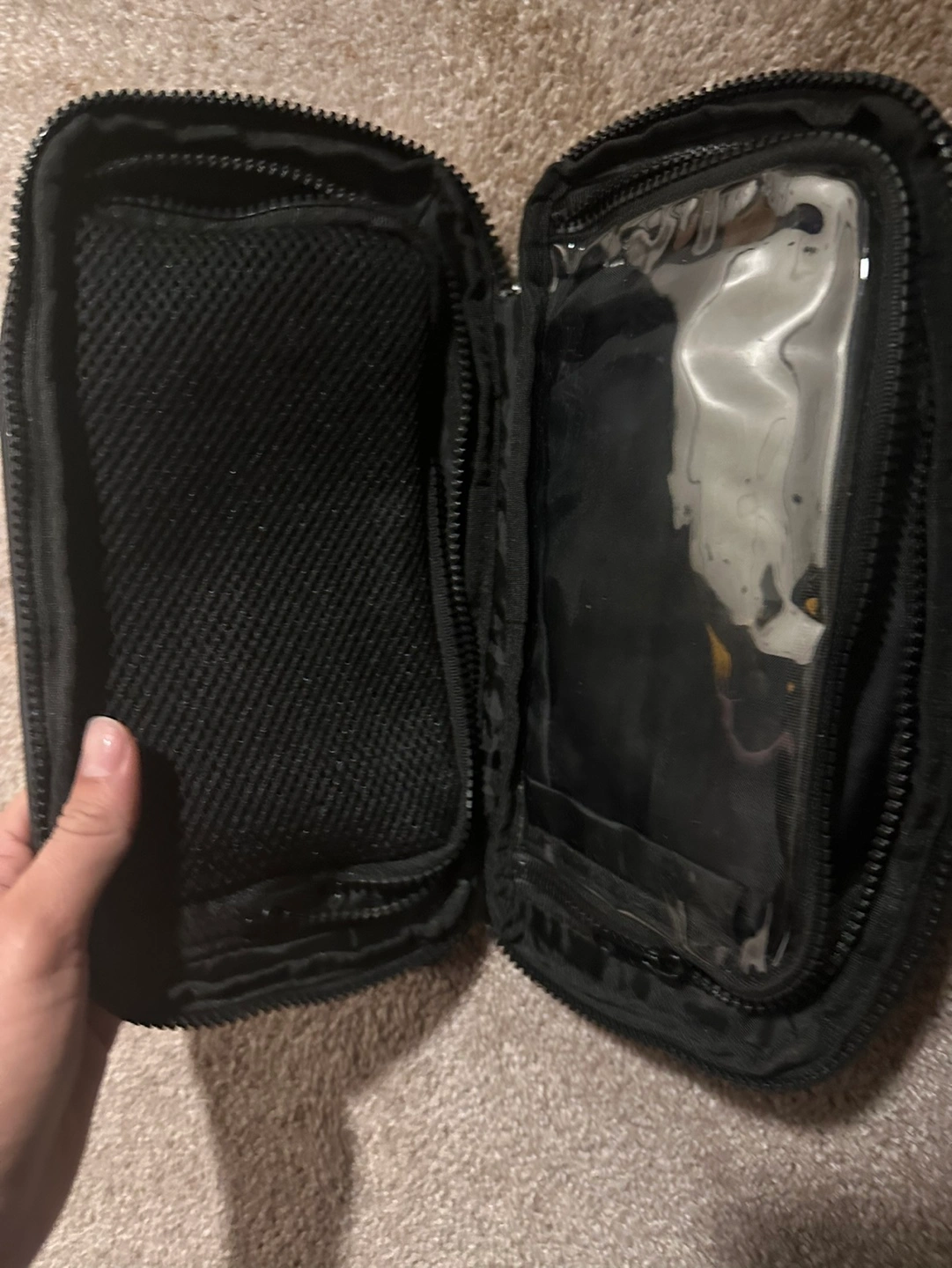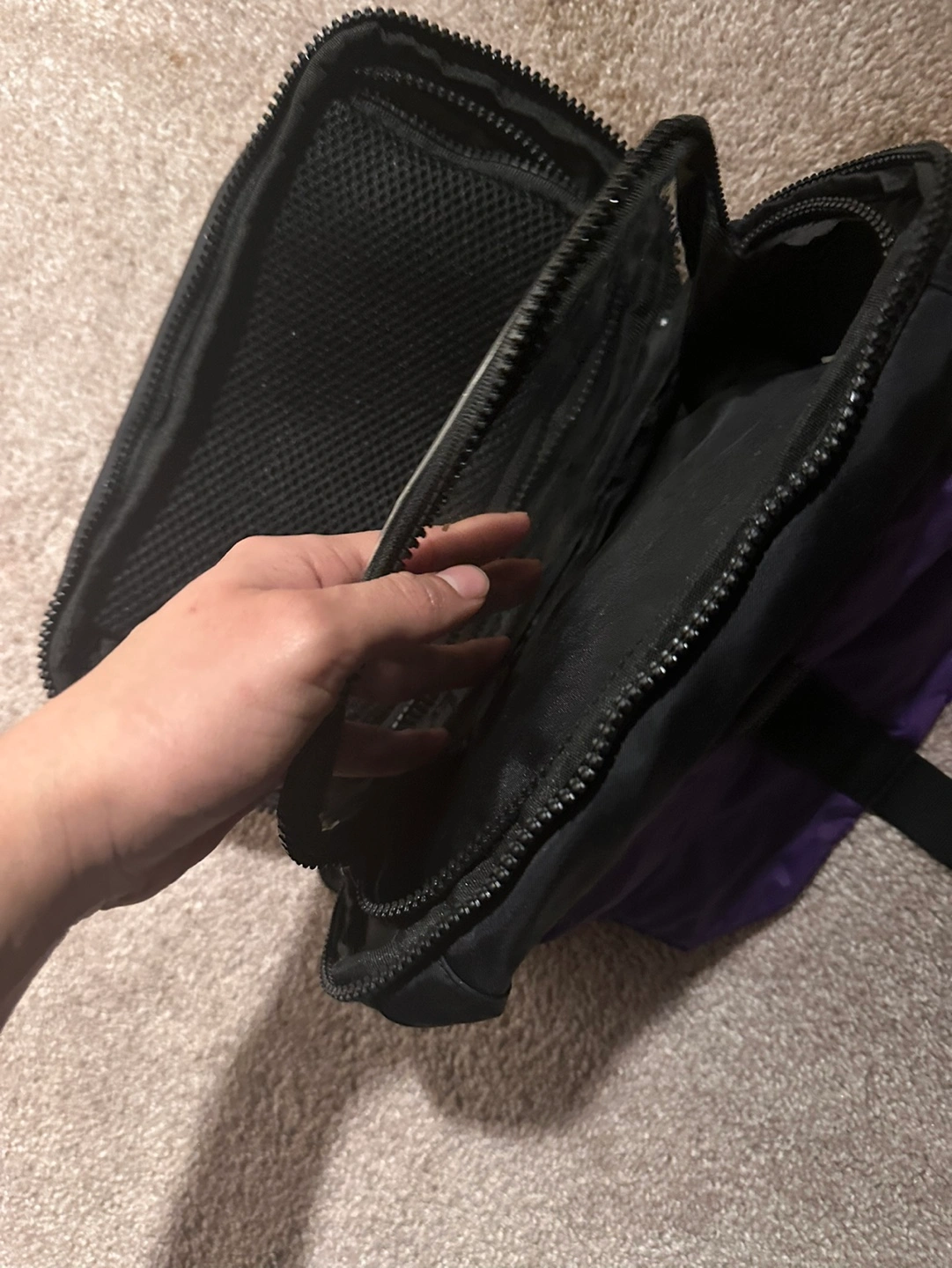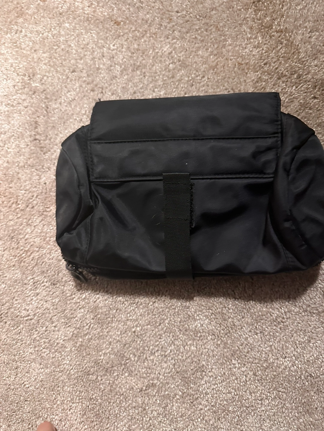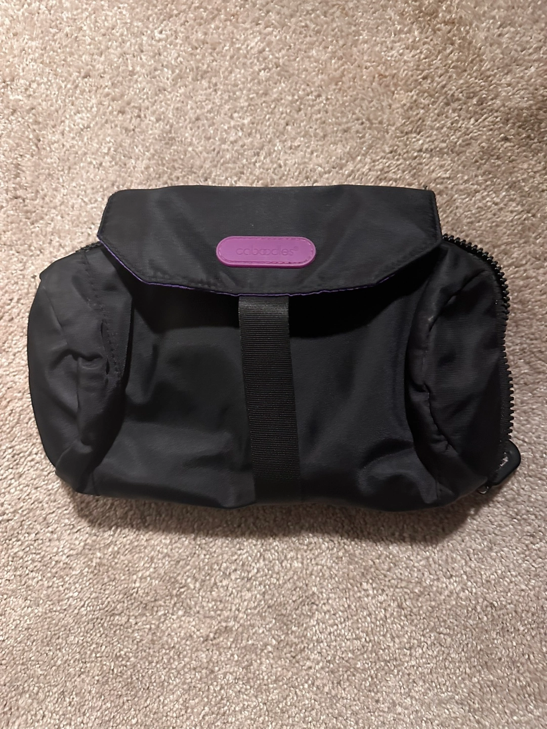 Black nylon travel makeup bag. Multiple zippered compartments. Interior mesh and clear plastic pockets. Purple accents. Small and lightweight.