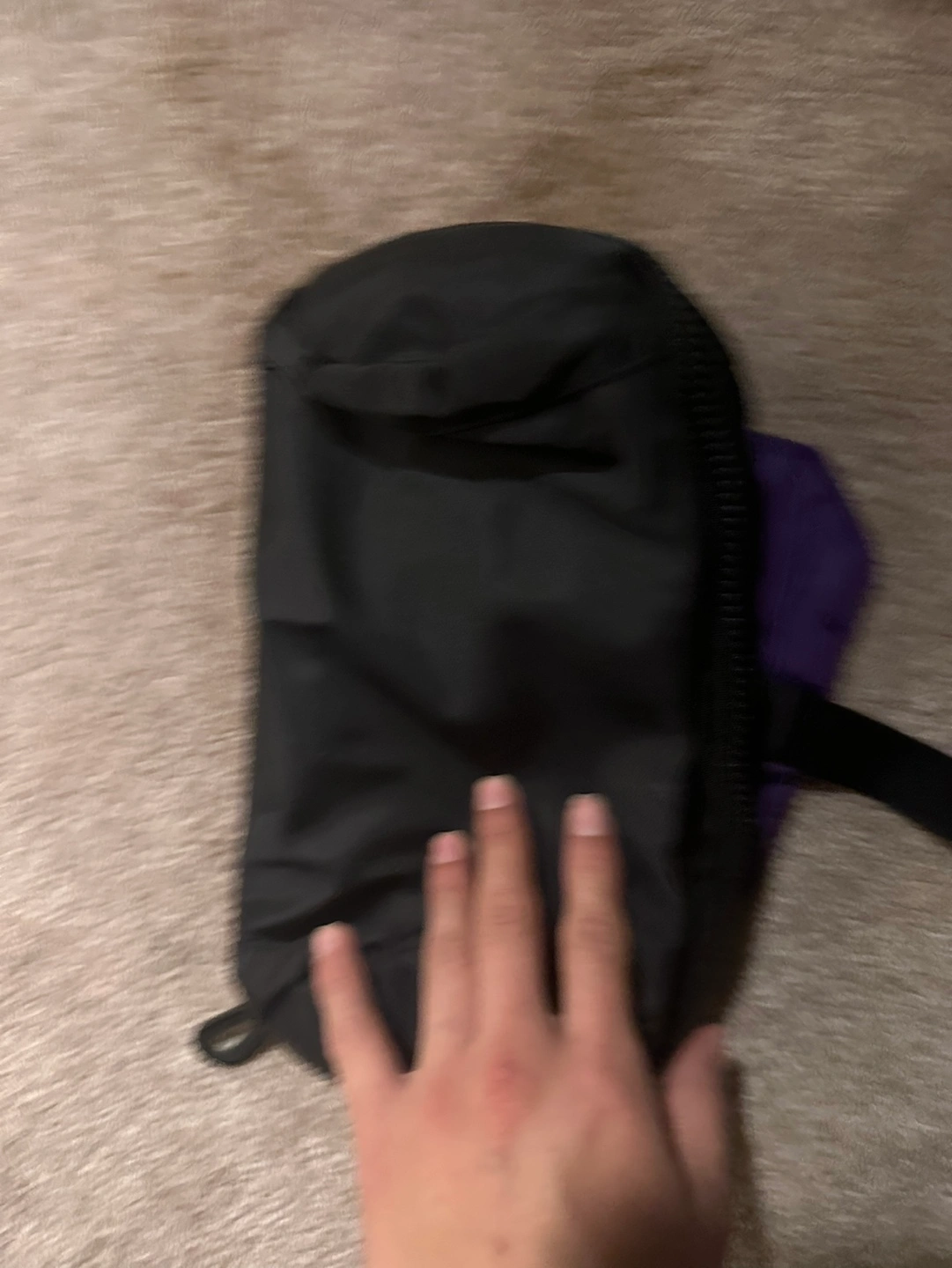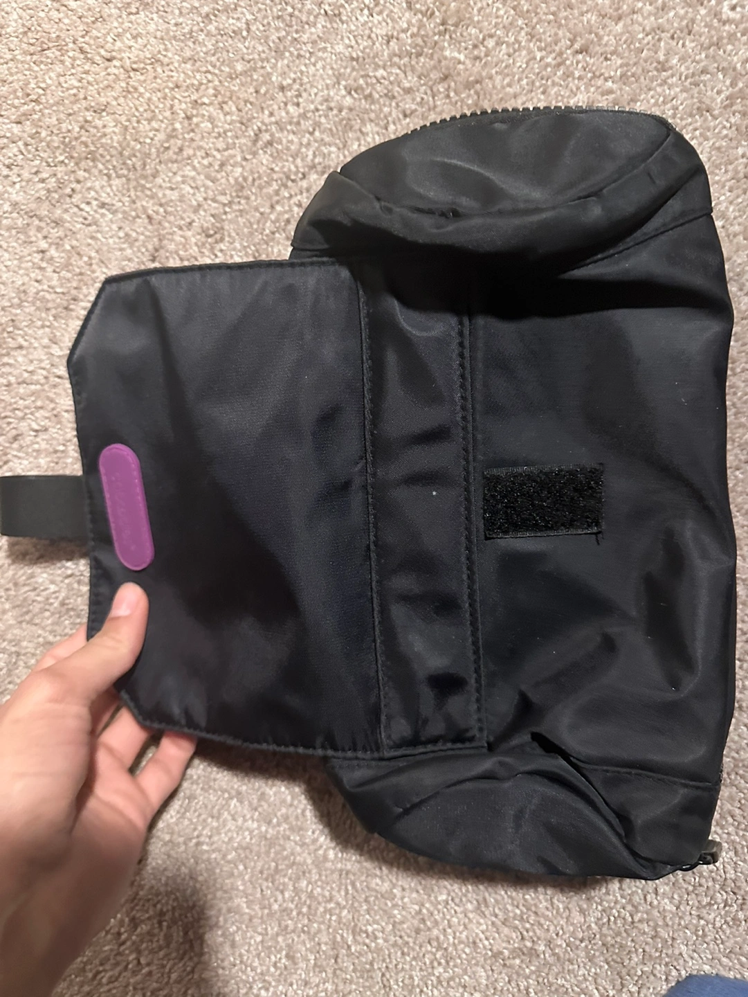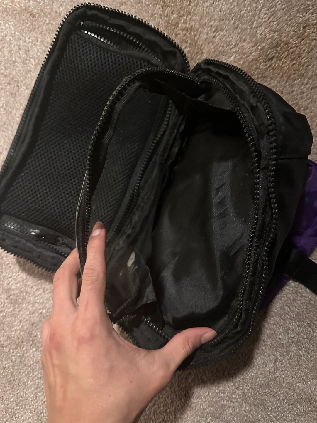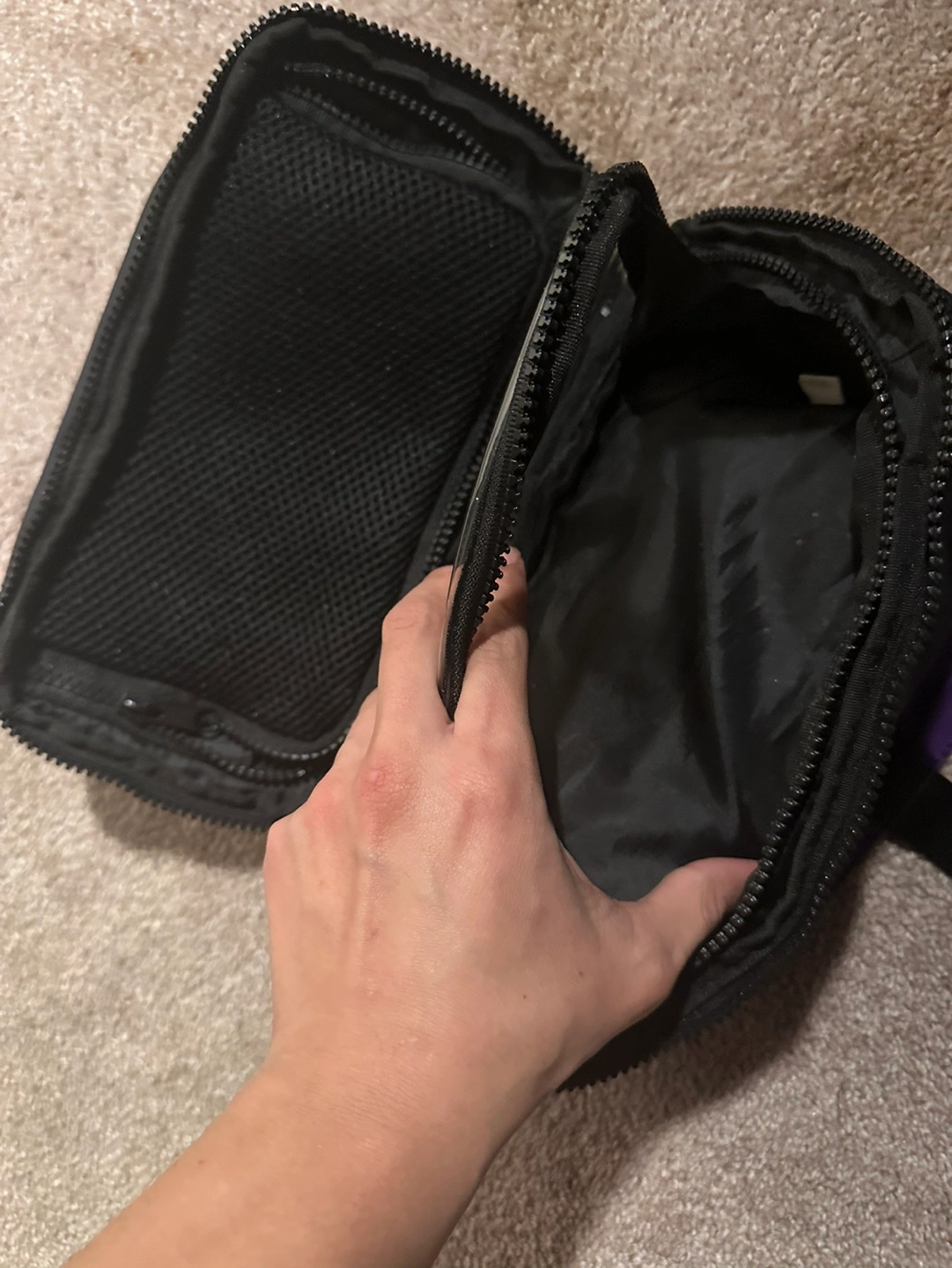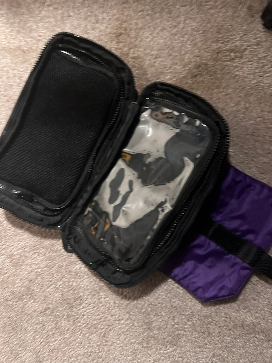 Black nylon travel makeup bag. Multiple zippered compartments. Interior mesh and clear plastic pockets. Purple accents. Small and lightweight.