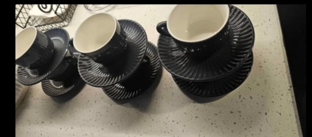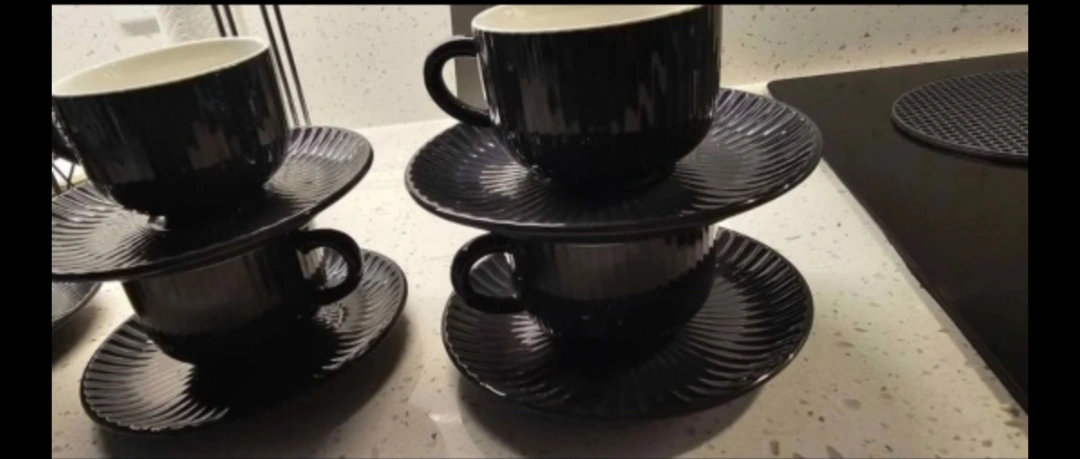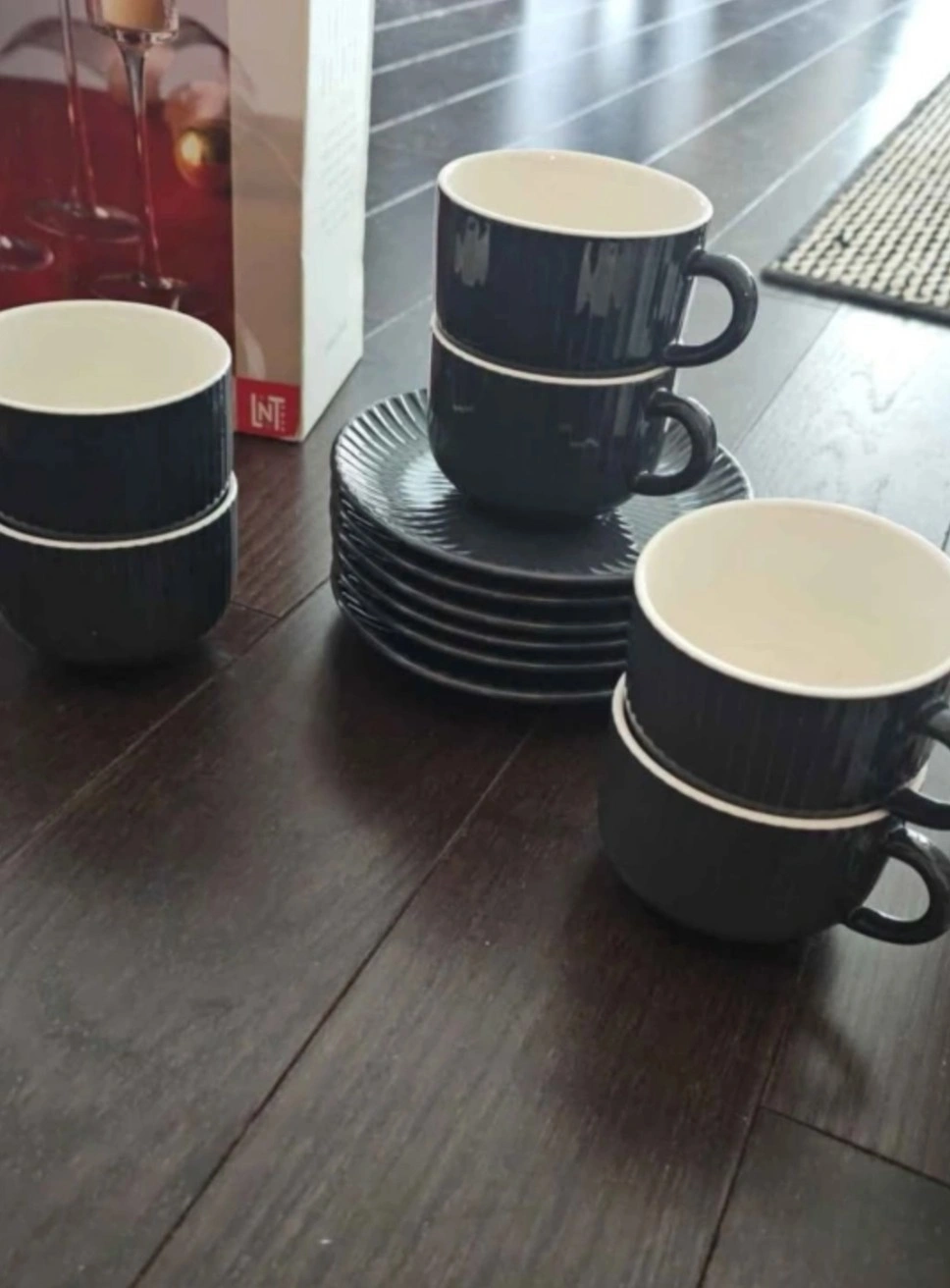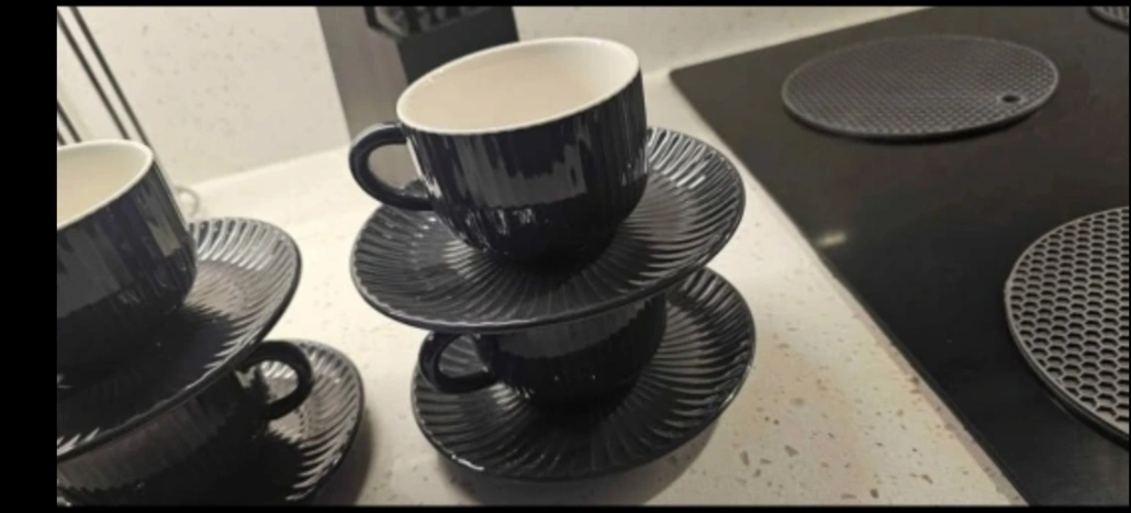 brand new, never used!!! purchased , moved and never used 6 oz cups and saucer sets dark grey / charcoal in colour set of 6 pickup downtown ottawa