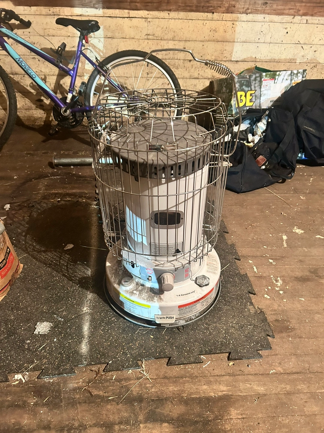 Portable kerosene heater. Good for garages or workshops. Includes safety cage.