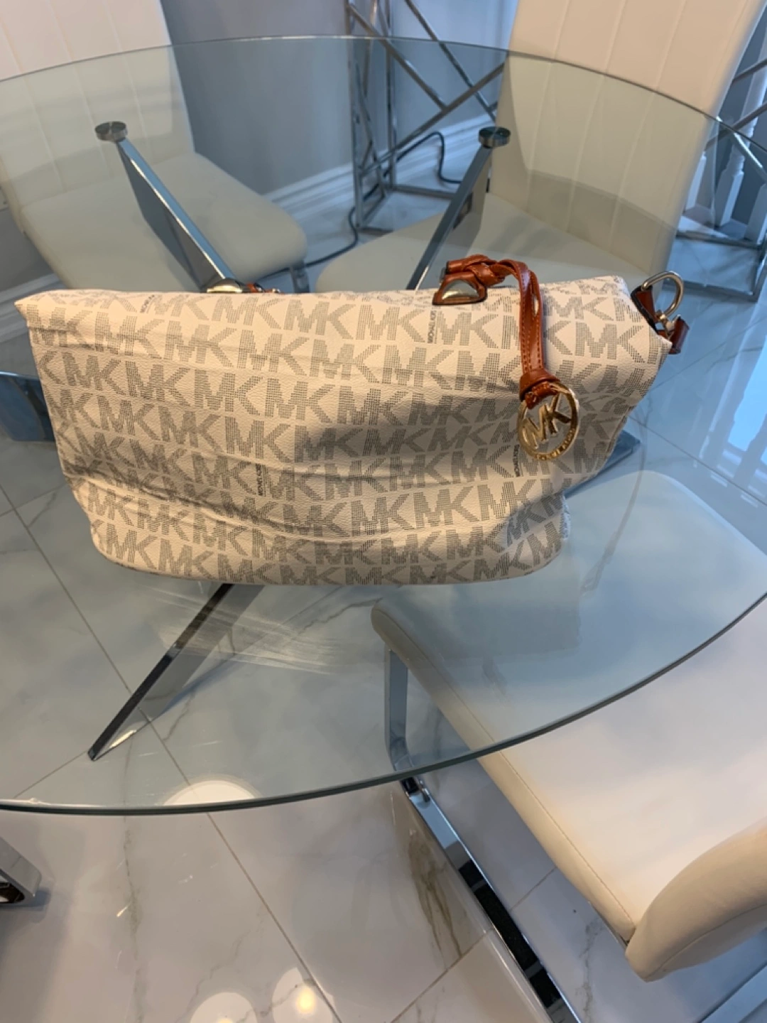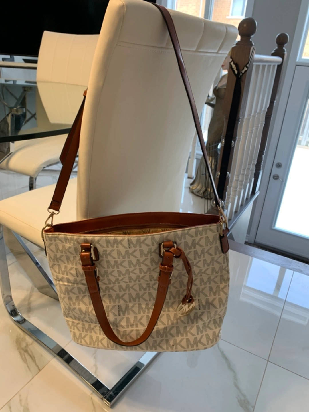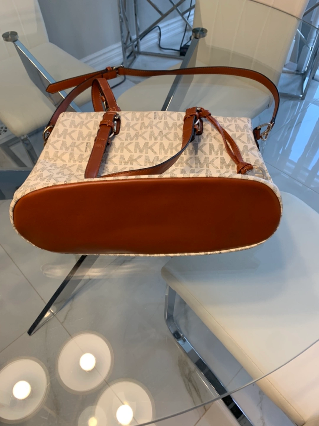 Cream and brown tote bag. Features an adjustable shoulder strap and top handles. MK signature pattern throughout. Interior pockets. Has some creases otherwise excellent condition. Cannot confirm authenticity. Nonetheless a beautiful bag. Priced to sell