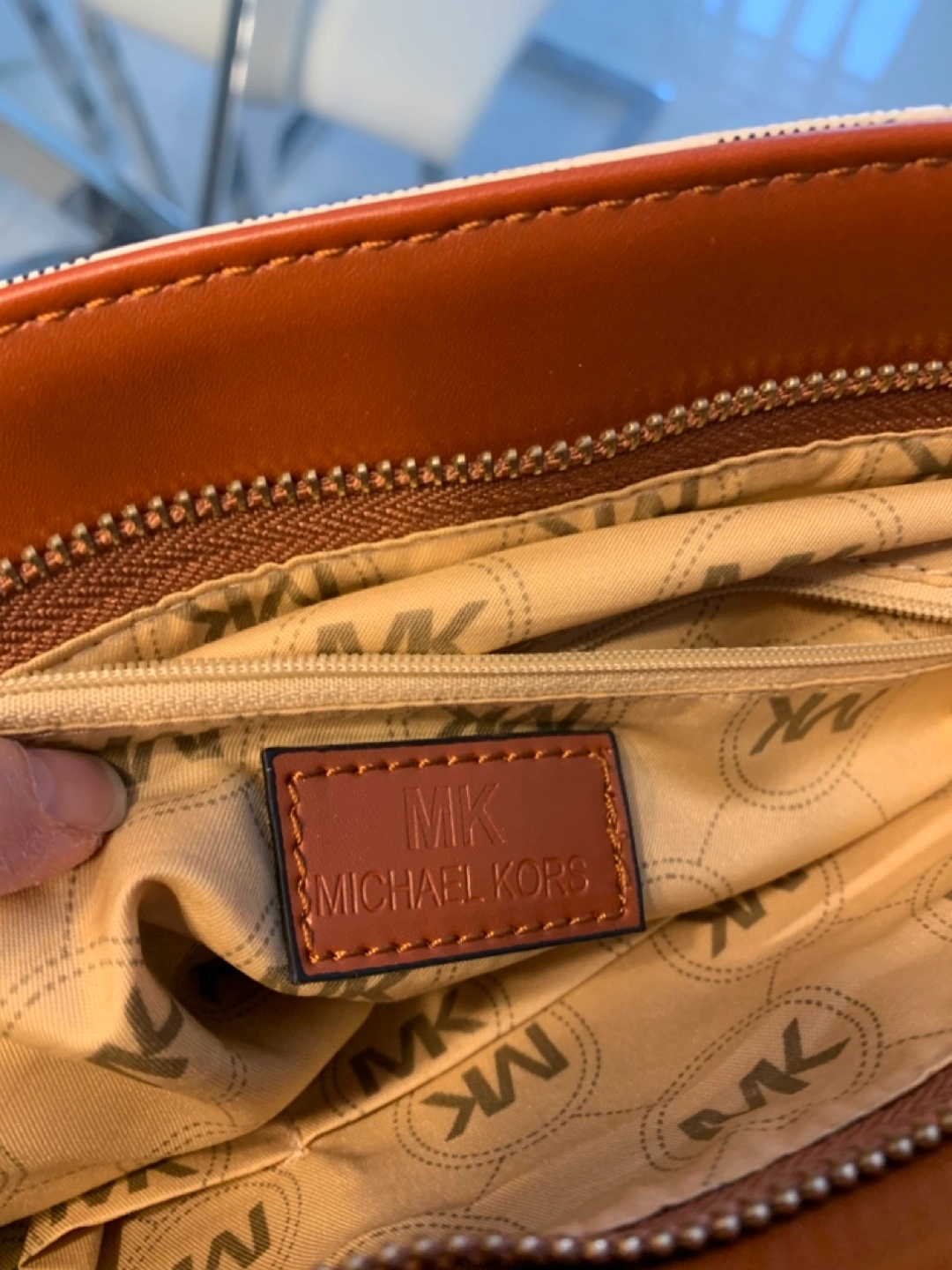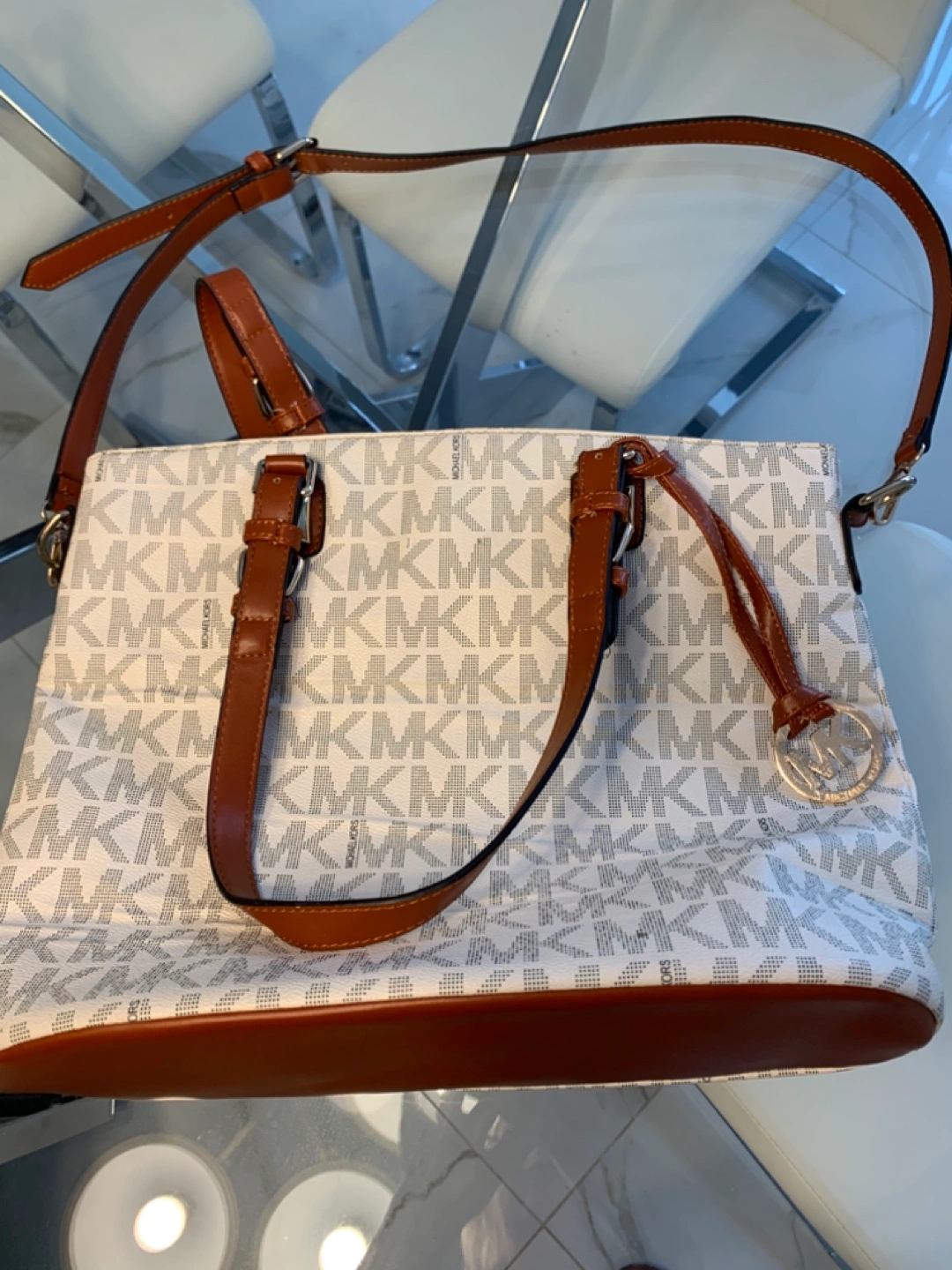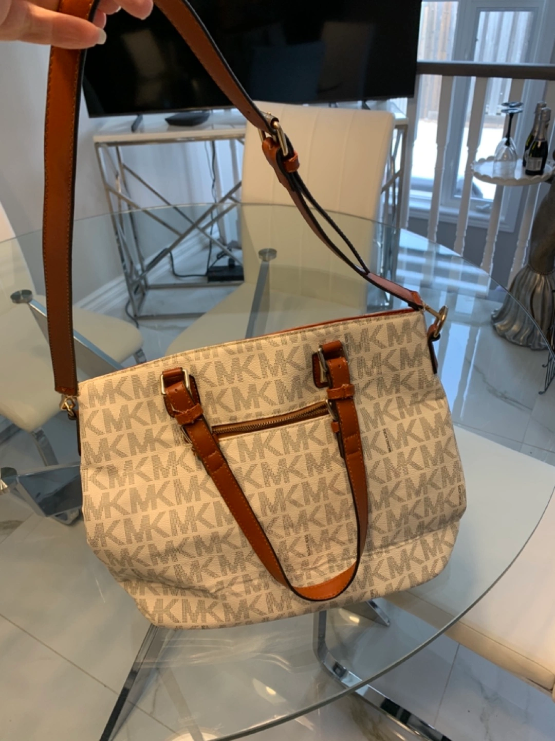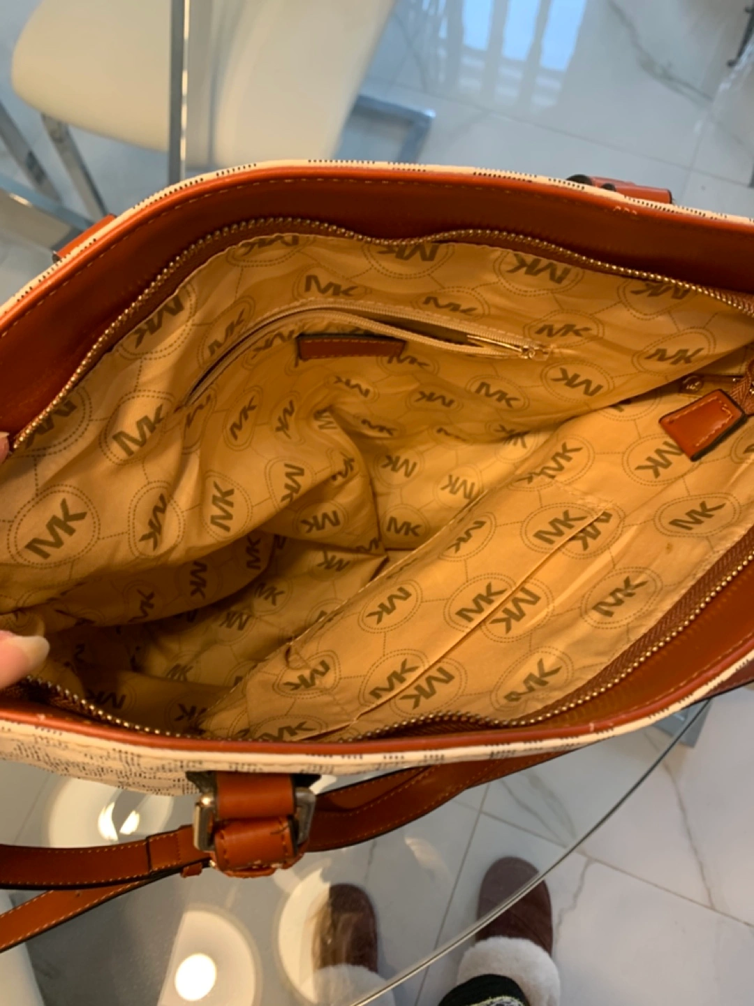 Cream and brown tote bag. Features an adjustable shoulder strap and top handles. MK signature pattern throughout. Interior pockets. Has some creases otherwise excellent condition. Cannot confirm authenticity. Nonetheless a beautiful bag. Priced to sell