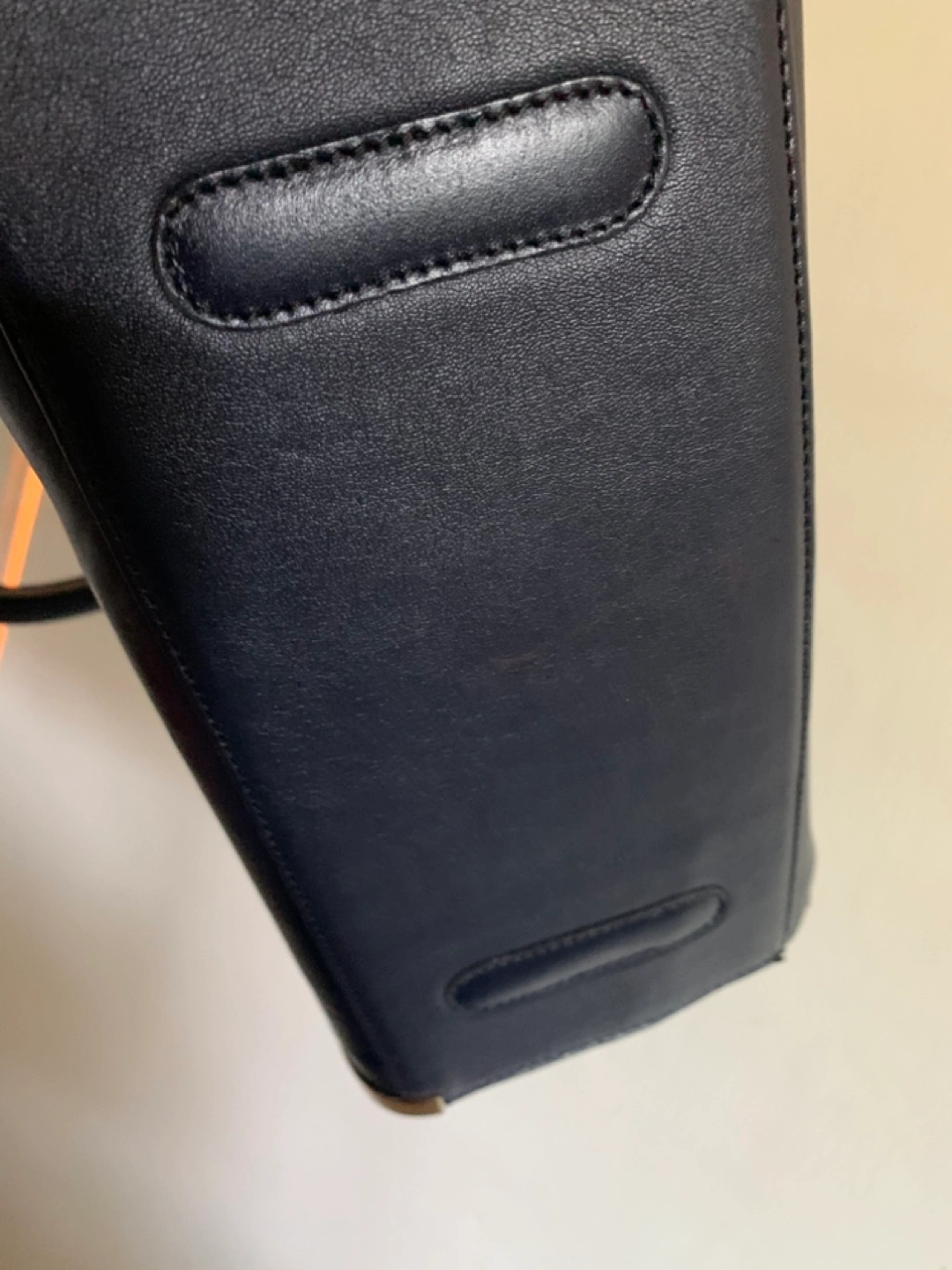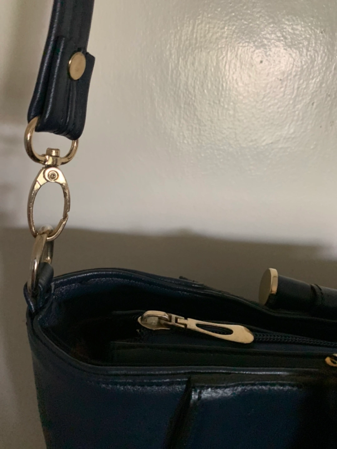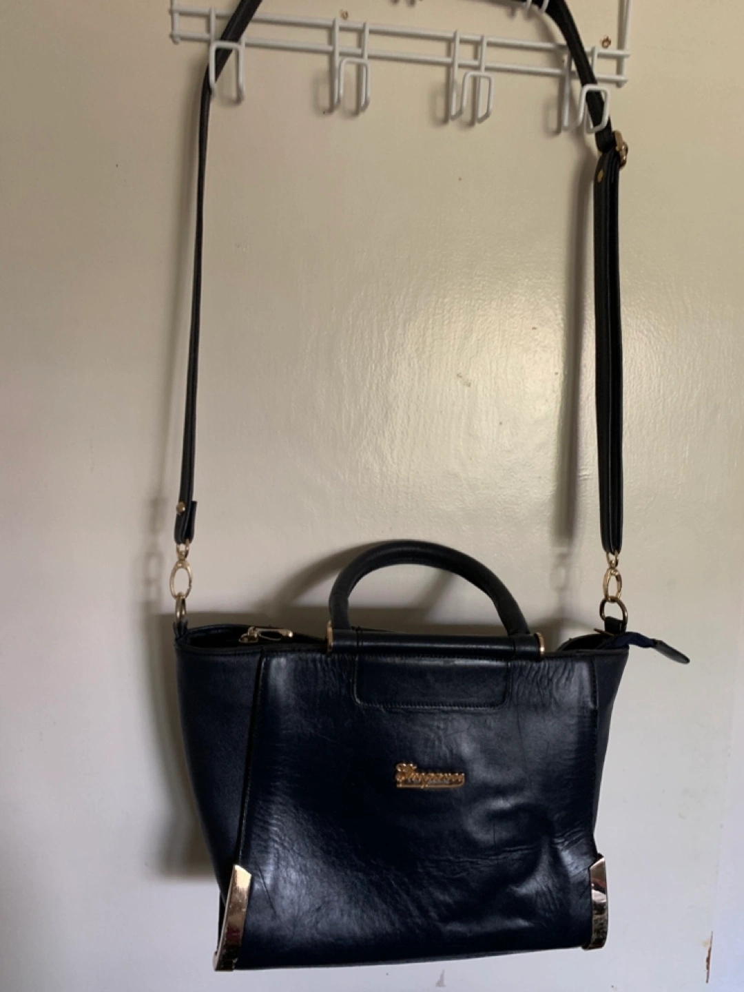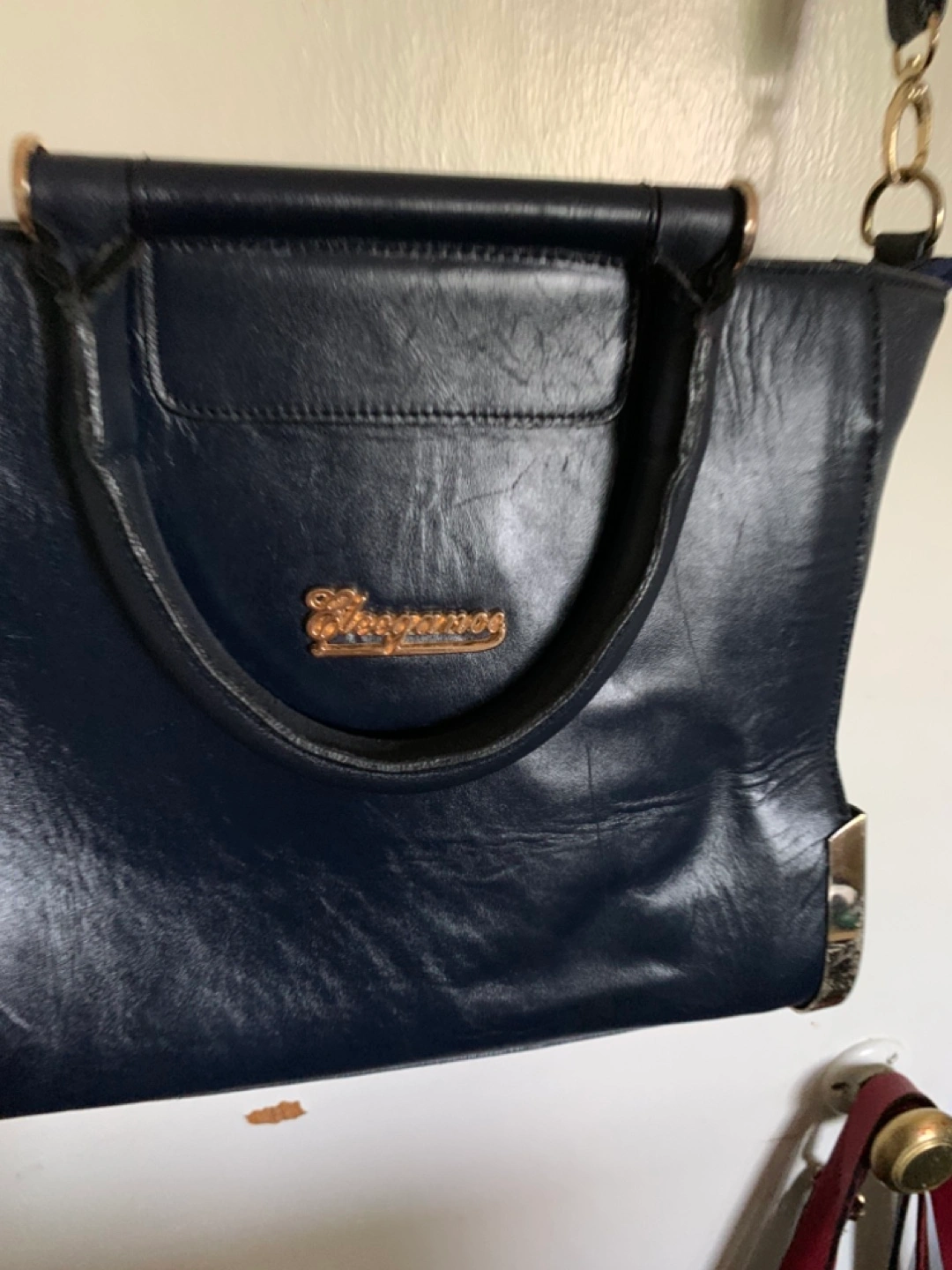 Stylish navy blue handbag. Features top handles and a detachable shoulder strap. Multiple interior compartments. Gold-tone hardware accents.