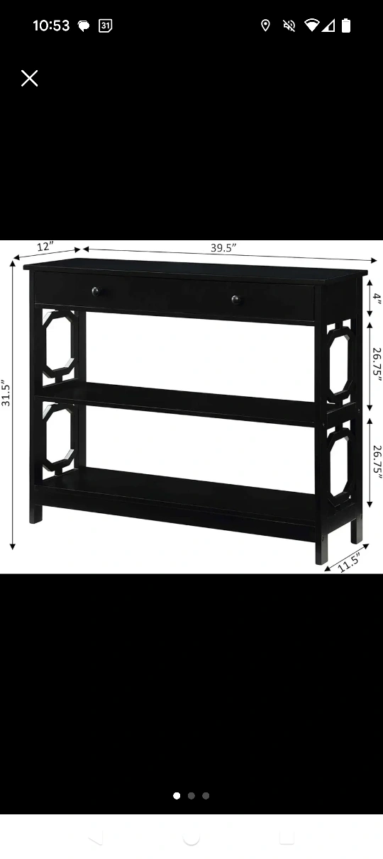 Elegant black console table. Features one wide drawer and two open shelves. Geometric octagon cutouts on the sides. Very Good condition, minor scuff on one leg. Currently wrapped and ready for transport. Sells for $200+