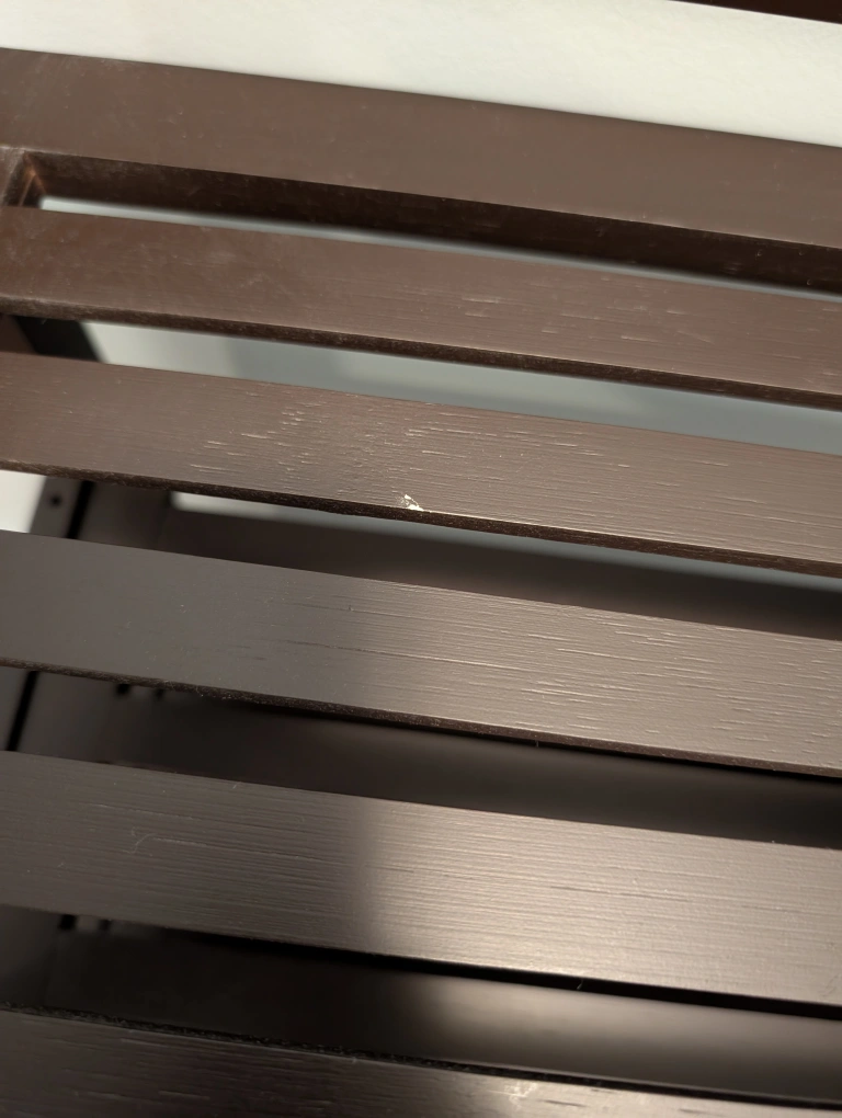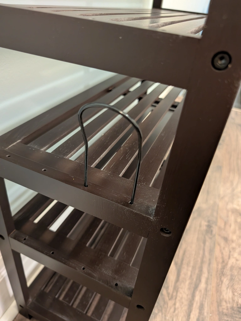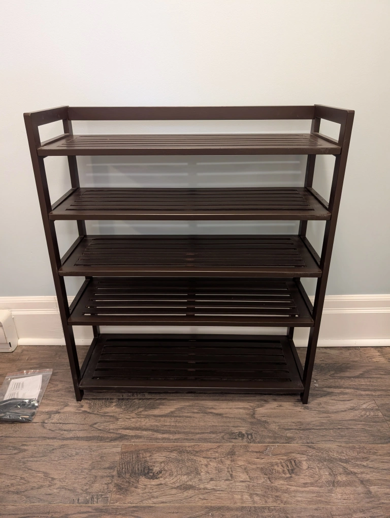 Five-tier shoe rack. Dark brown finish. Minor scuff on top shelf. Includes extra shoe storage via wires that can be attached to sides as pictured in last photo. Purchased for $70. From a smoker and pet-free home. Pickup only please