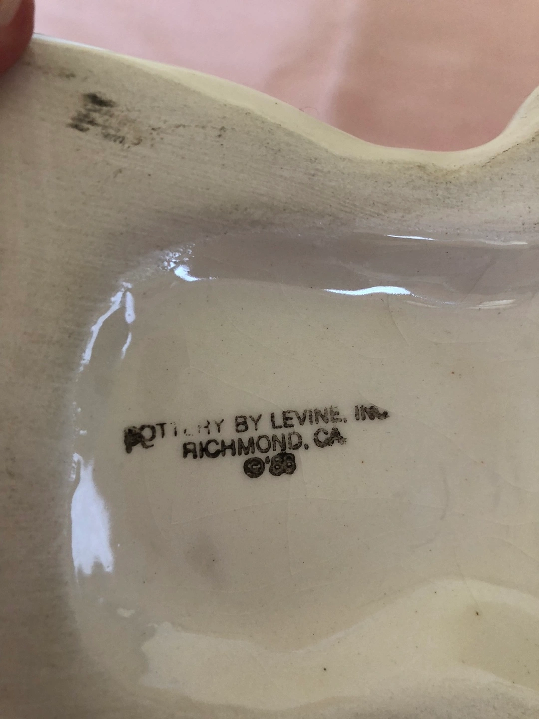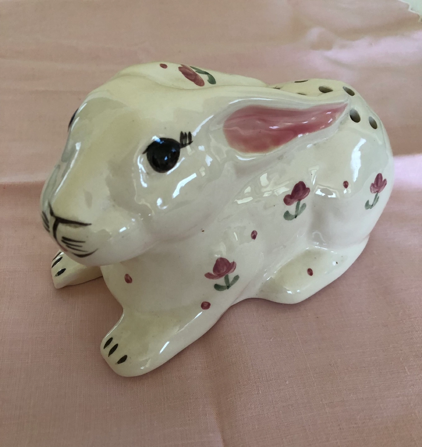 Adorable vintage potpourri cover. Cream coloured with pink accents. Great spring acccent near a vase of tulips. Made in Richmond, CA. 8” long x 3”wide x 5” high. Yonge/Davisville pick up.