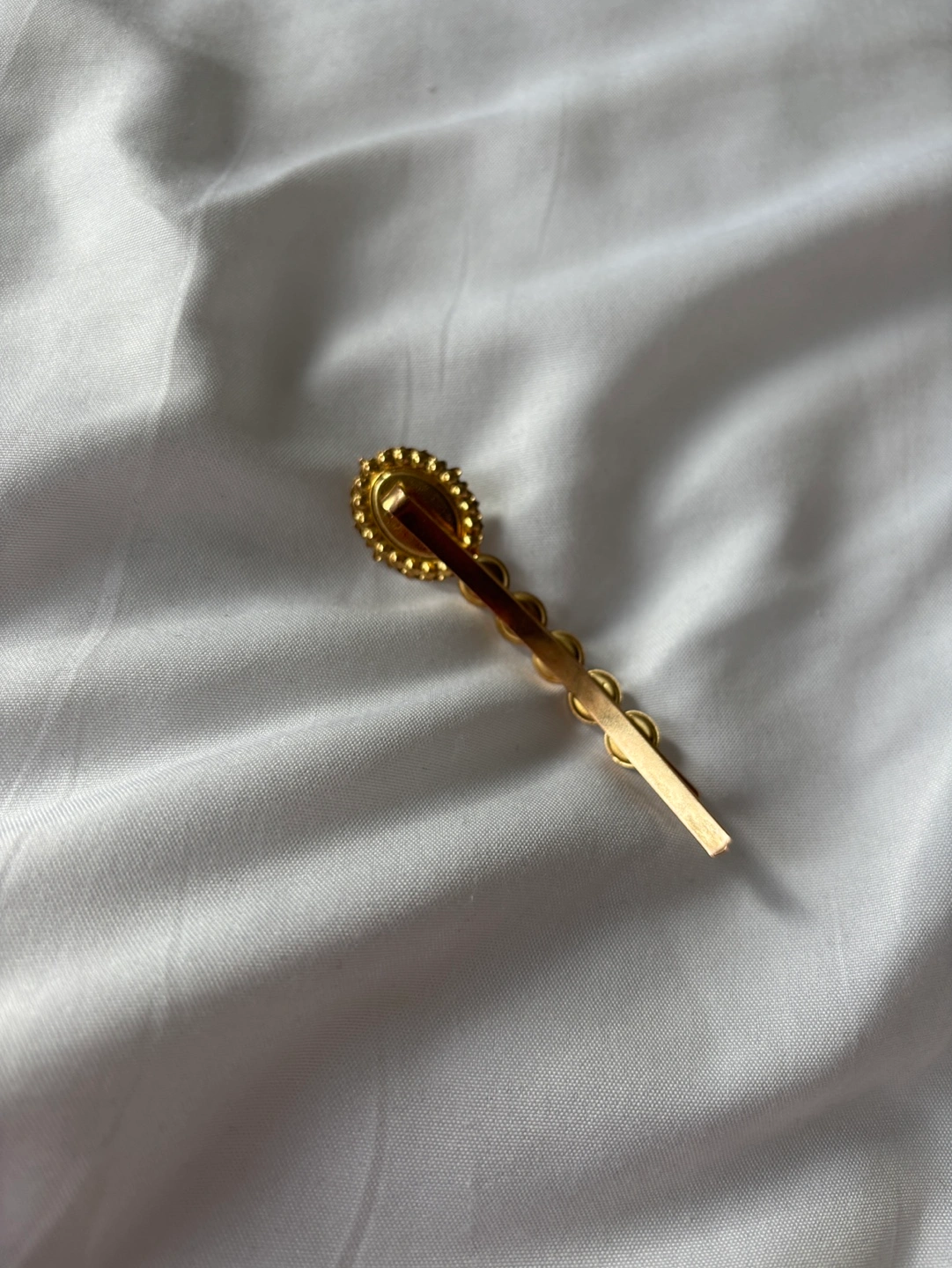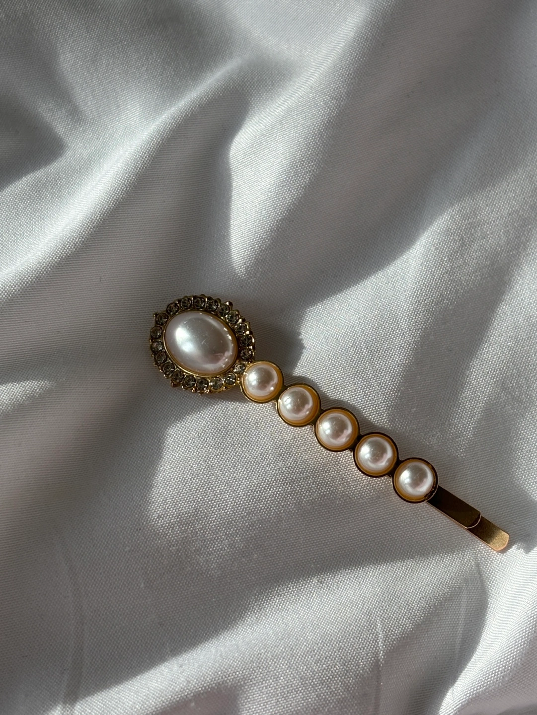 Gold-tone hair clip. Approx 3’’ long. Features a large faux pearl accented with clear rhinestones. Five smaller faux pearls adorn the barrette. Looks lovely in hair. Cash only. Pick up at RBC Bathurst and Sheppard or see my bio for other location options! I’m available to answer any questions :)