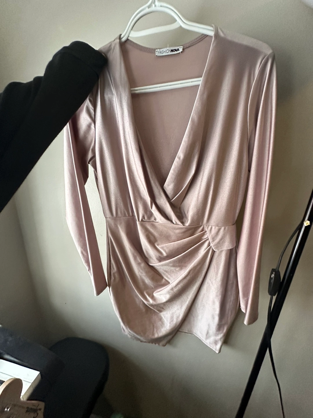 Never used Long sleeve mini dress. Mauve colour. Wrap style. Slight ruching detail.