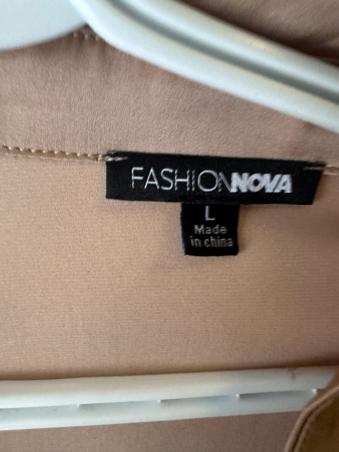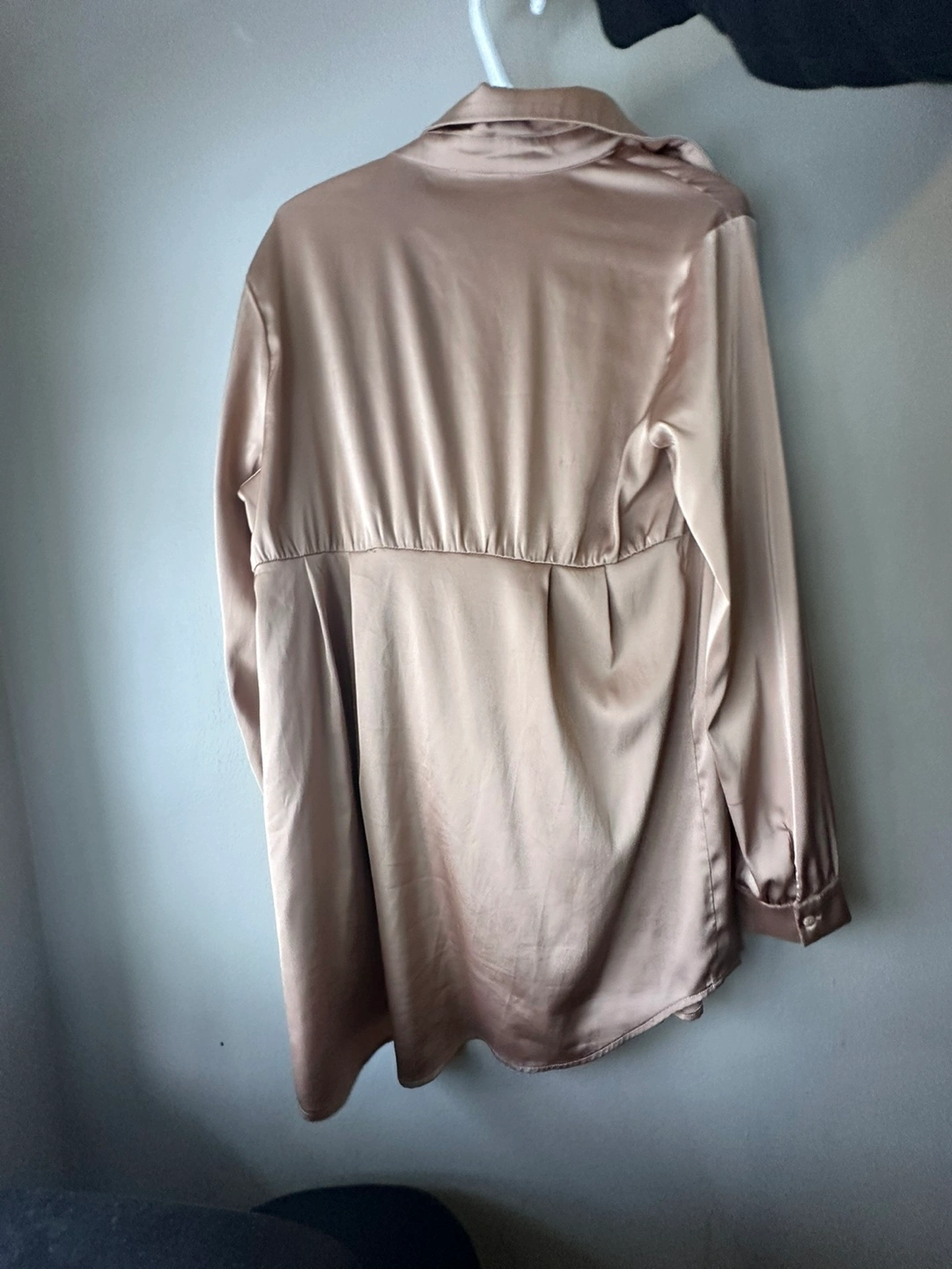 Long sleeve satin blouse. Champagne colour. Size large. Button closure. Made in China.